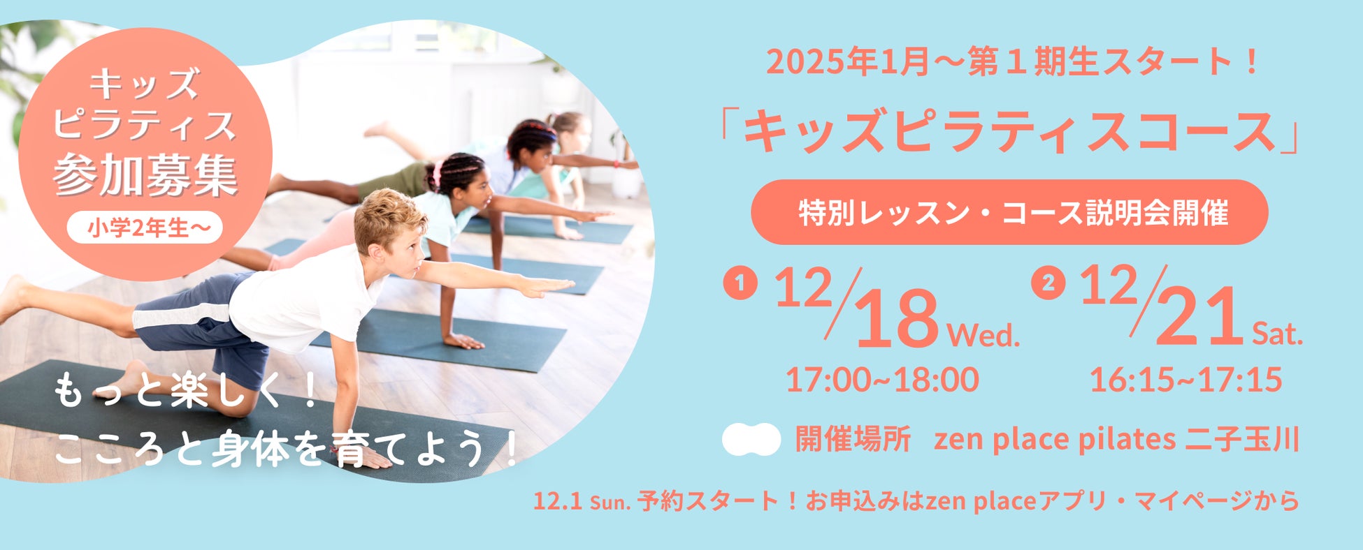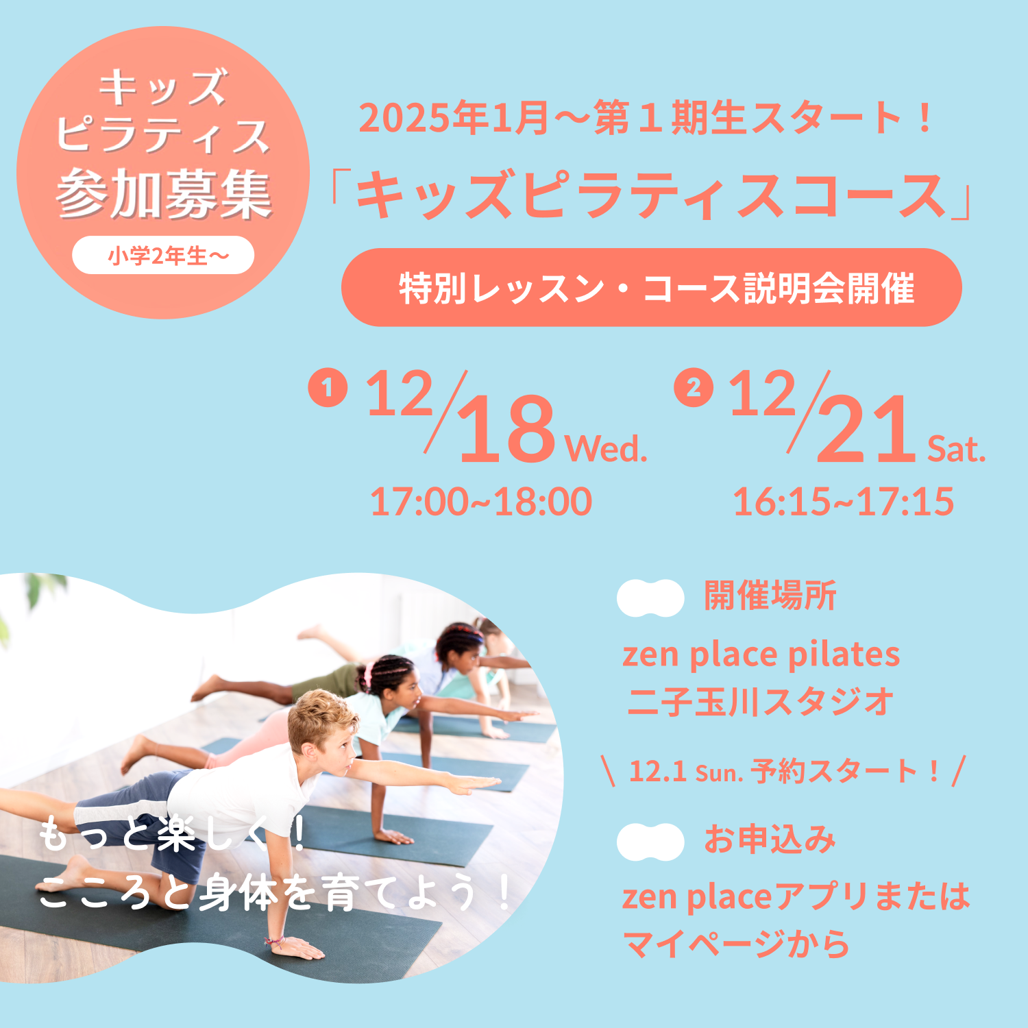 最先端研究結果・科学をもとに、グローバルな環境で最新技術とDXで挑戦を重ね、サービス業界にイノベーションを起こしている最先端のWeb3.0 DX企業であり、ウェルビーイング創造のリーディングカンパニーである株式会社ZEN PLACE(本社:東京都渋谷区 代表取締役:尾崎成彦)は、現代の子どもに向けた「キッズ・ピラティスコース」を2025年1月15日(水)にスタートします。