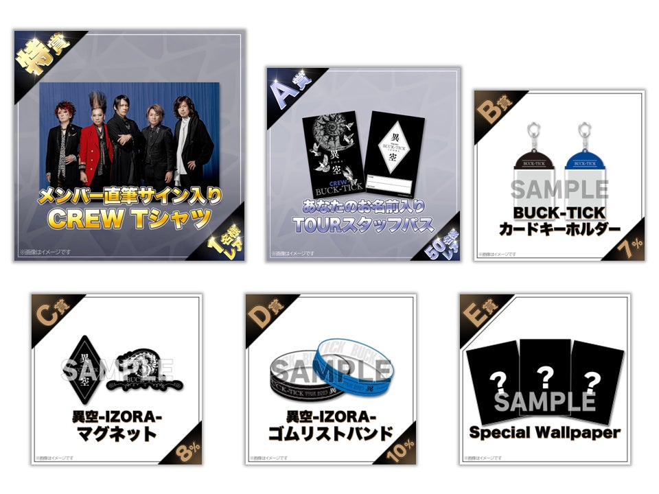 他にもここでしか手に入らない、『BUCK-TICKカードキーホルダー』や『異空-IZORA-マグネット』、『異空-IZORA-ゴムリストバンド』、『Special Wallpaper』など、いずれかの特典が当たるハズレなしのくじです。