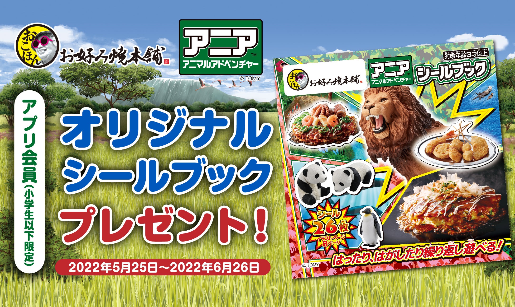 株式会社物語コーポレーション(本社:愛知県豊橋市/代表取締役社長:加藤 央之)は、全国26店舗展開中の『お好み焼本舗』にて、2022年5月25日(水)〜6月26日(日)の期間限定で、動物フィギュア「アニア アニマルアドベンチャー」(発売元:株式会社タカラトミー 以下「アニア」)とコラボレーションした、アニア「オリジナルシールブック」をプレゼントいたします。