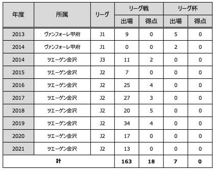 J1リーグ 9試合(0得点) / J2リーグ 143試合(16得点)