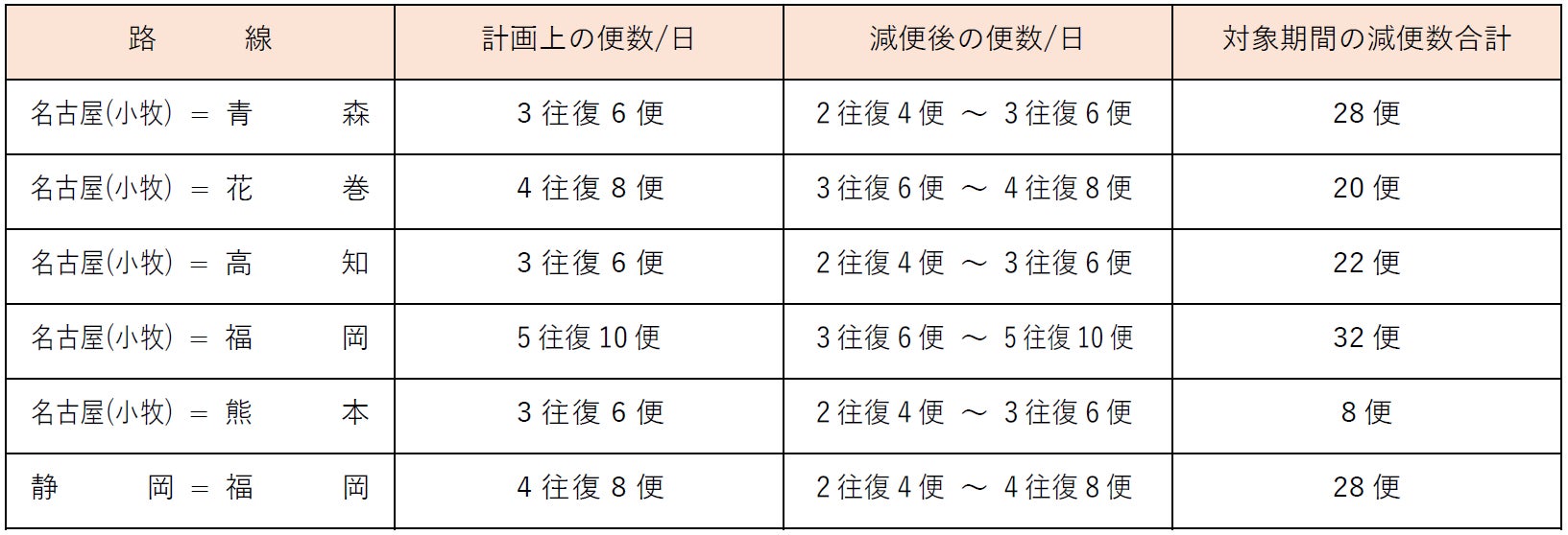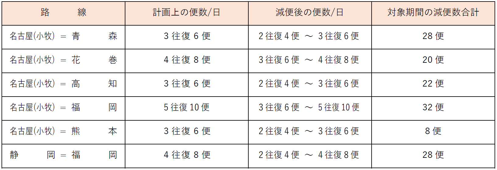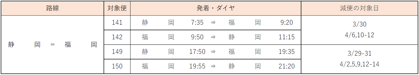 株式会社フジドリームエアラインズ(略称:FDA、本社:静岡県静岡市、代表取締役社長:楠瀬 俊一)は、新型コロナウイルス感染症の影響による航空需要の減少に伴い、3月27日(日)~4月15日(金)の期間、以下の路線での減便を決定いたしました。