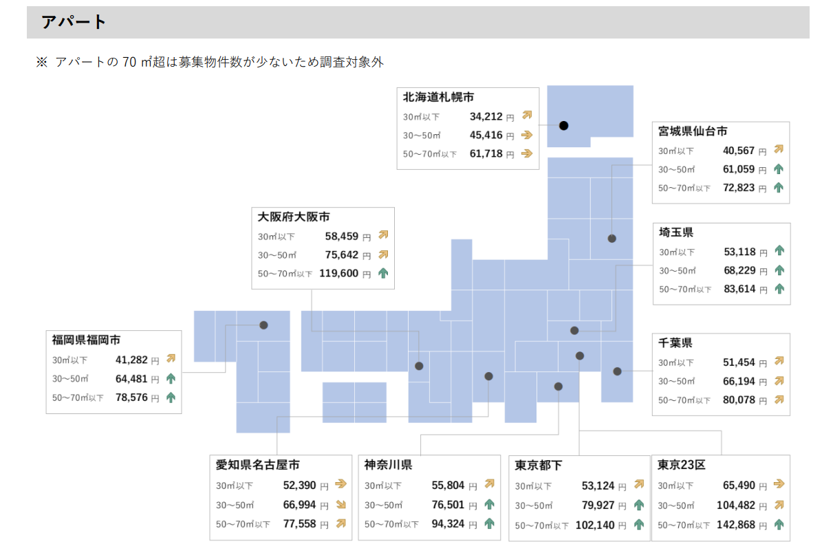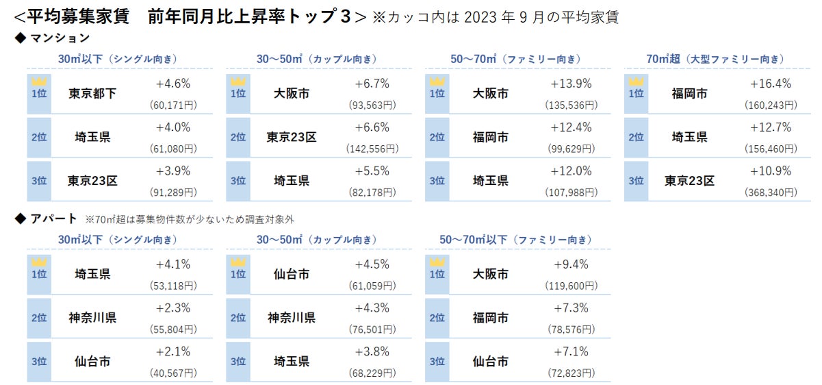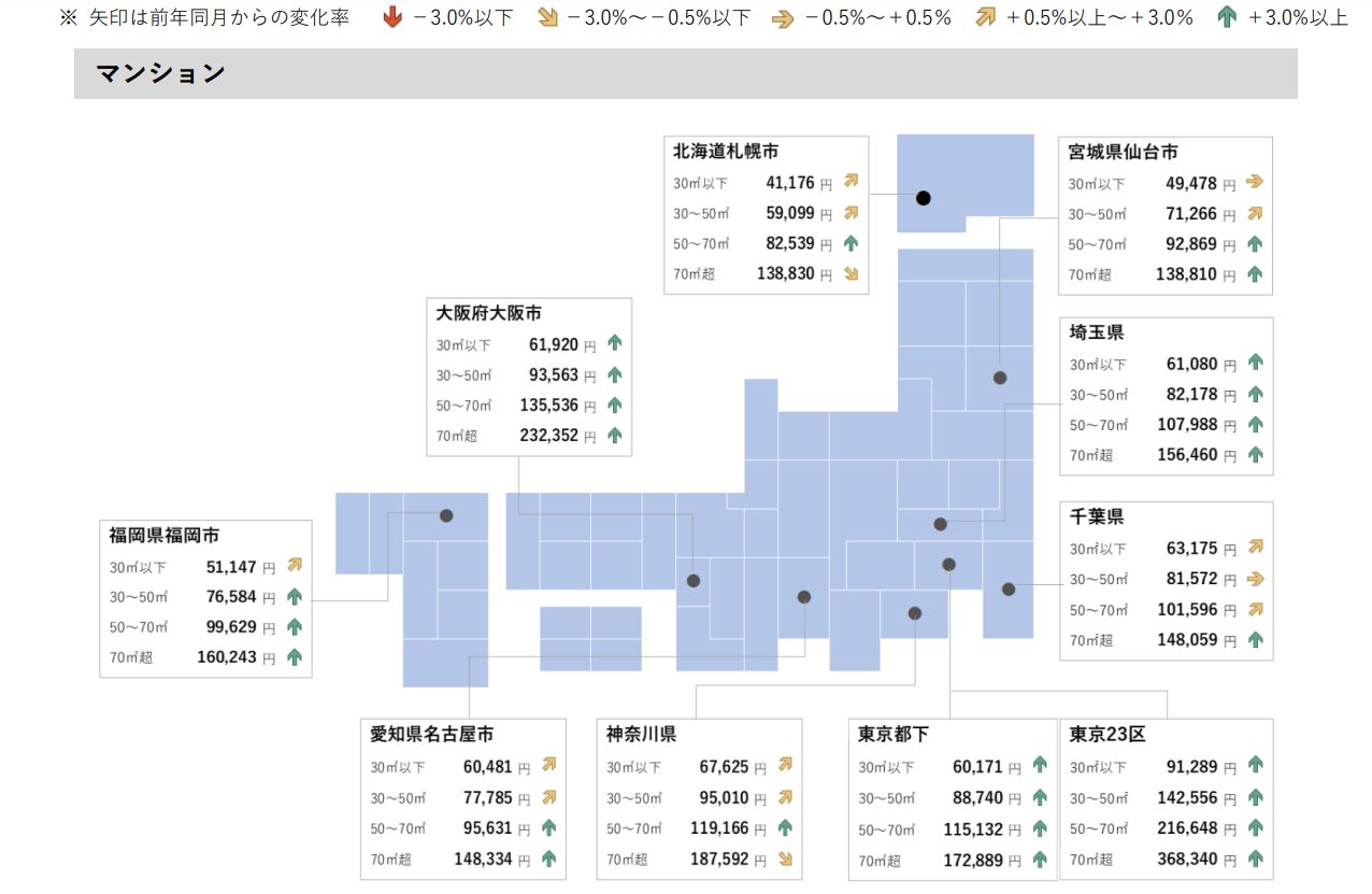 マンションの平均募集家賃は、東京23区・東京都下・埼玉県・仙台市・名古屋市・大阪市・福岡市の7エリアが全面積帯で前年同月を上回る。