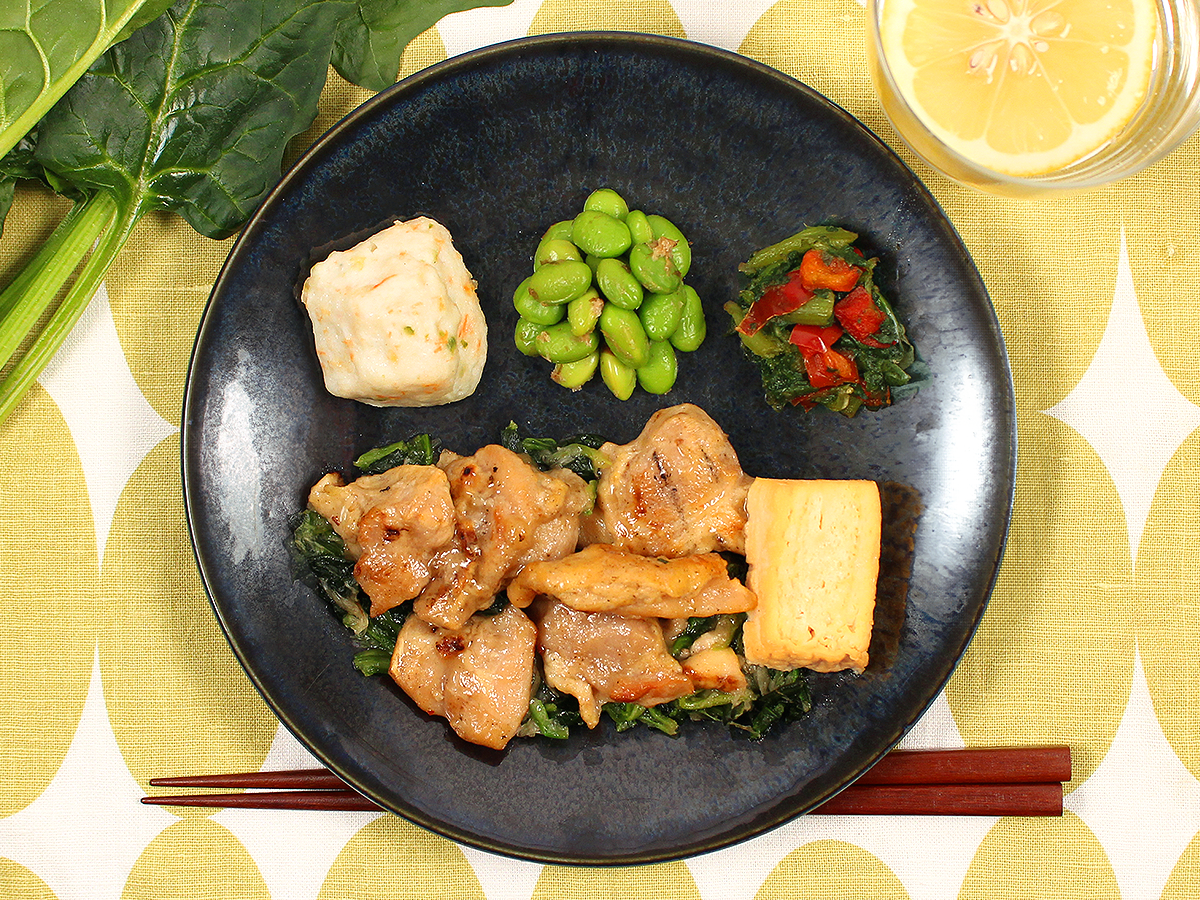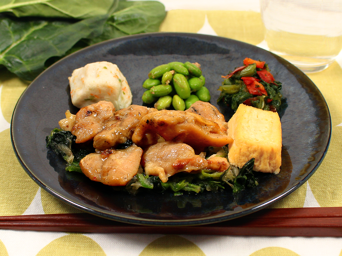 副菜は、白身魚のつみれ、鰹節をまぶした枝豆のあえもの、赤ピーマン入りの春菊のおろし和えです。