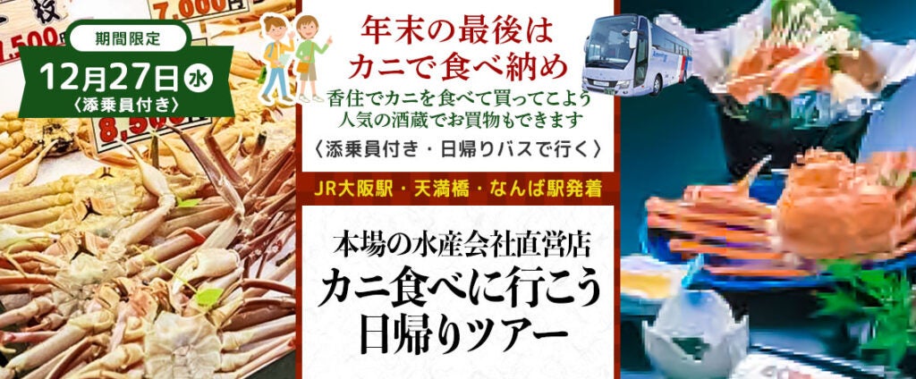 おひとり様¥13,800-~ 12月27日(水) 【兵庫県・香住】〈大阪駅・天満橋・なんば発着・添乗員付き〉香住でカニ食べて・カニ買うて来よう!年末の最後はカニで食べ納め日帰りバスツアー
