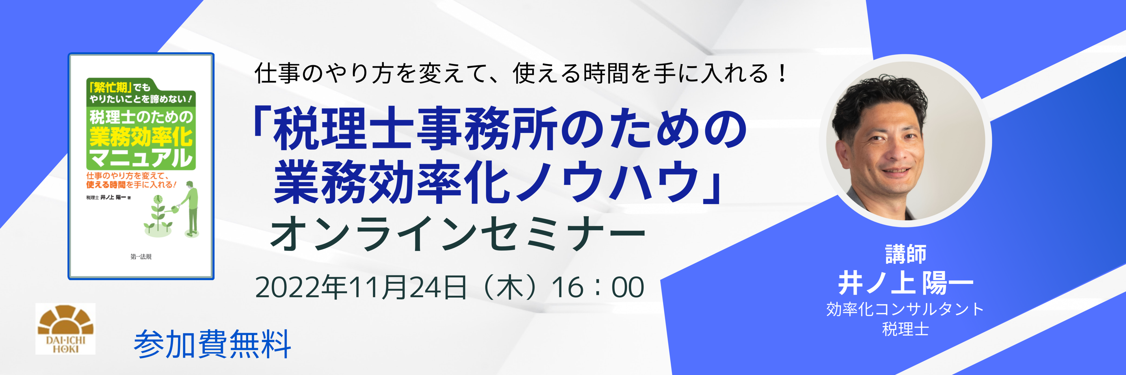 『「繁忙期」でもやりたいことを諦めない! 税理士のための業務効率化マニュアル 』(第一法規)の出版を記念して、著者の井ノ上陽一氏を講師にお招きし、オンラインセミナー(無料)を開催いたします。