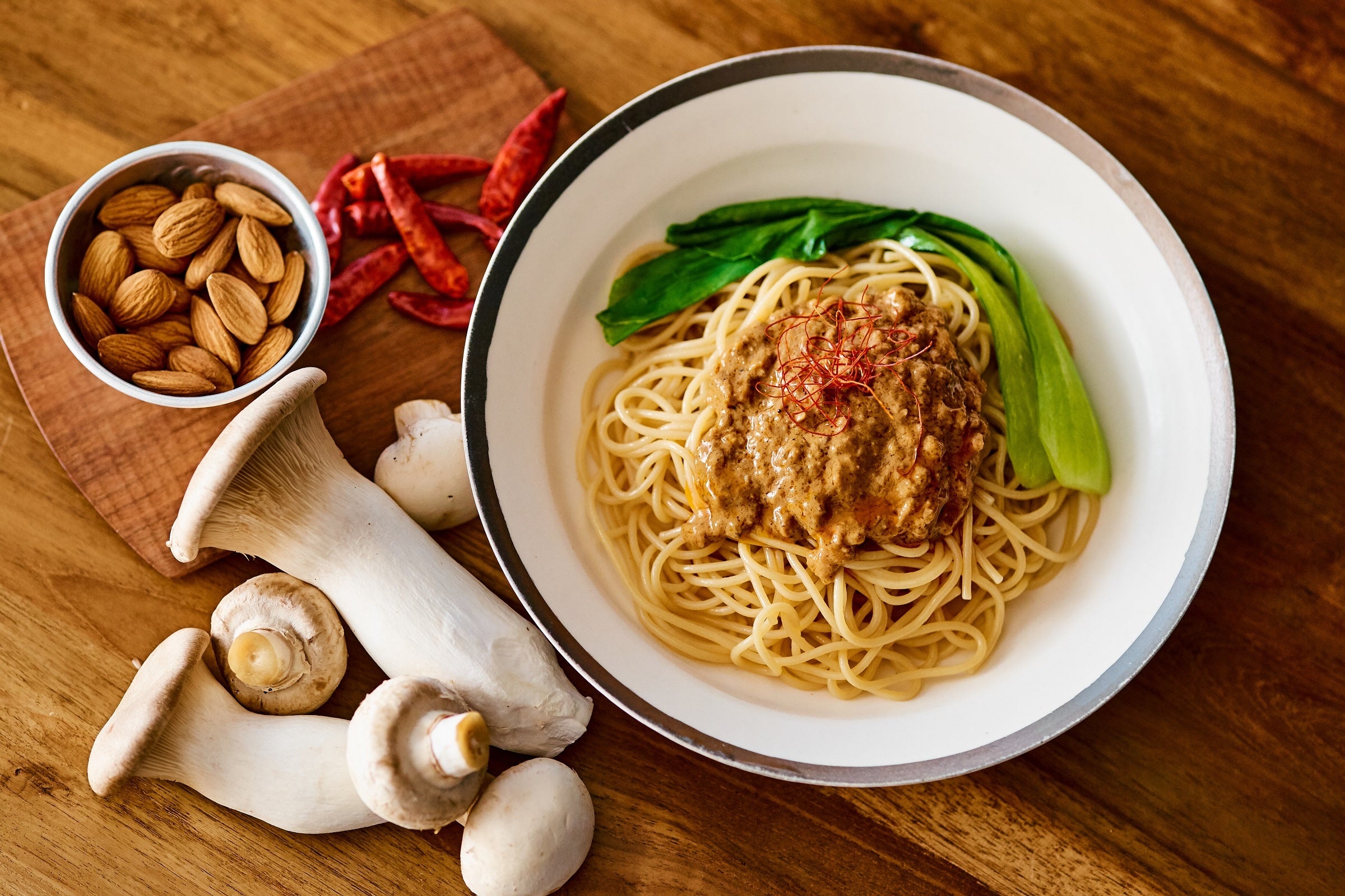 2種のまるごときのこ、アーモンドといった具材が入ったプラントベースのの汁なし担々麺の素です。クリーミーな豆乳に、ねりごま、みそ、ナッツを合わせた濃厚な旨みと、唐辛子のほどよい辛さに仕上げました。