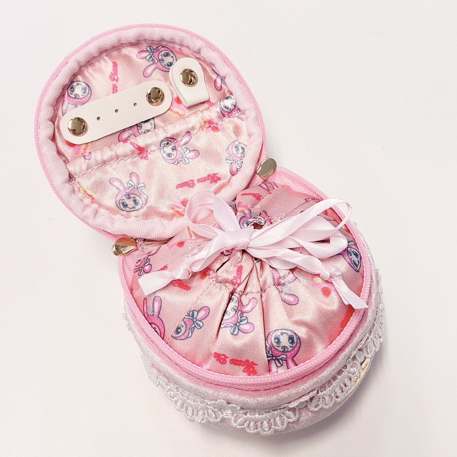 ケースを開けると、中には今回のオリジナル柄が広がり、ネックレスやピアスを整理できる巾着タイプの収納付き。お気に入りのアクセサリーを大切にしまえるのはもちろん、お部屋に飾ればときめきいっぱいのインテリアとしても楽しめます。思わず写真を撮りたくなる、特別なアイテムです。