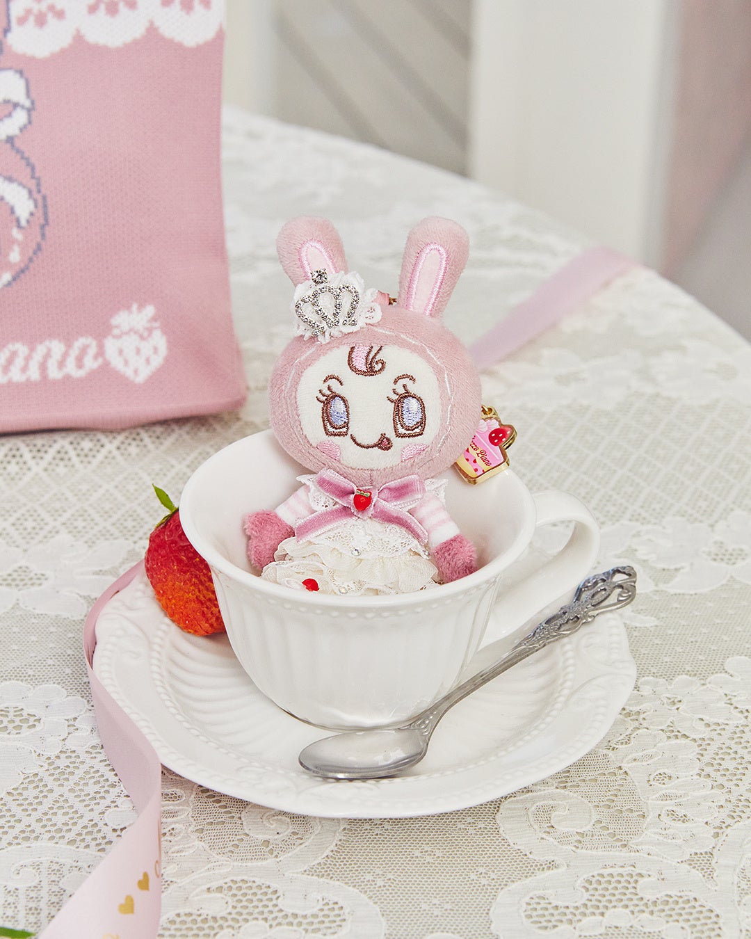 クリームみたいなフリルドレスに身を包んだ、ベリエちゃんのぬいぐるみチャーム。