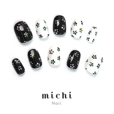 モノトーンにシンプルな小花が散りばめられたネイル。お花は手描き感が可愛い仕上がりになっています。モノトーンコーデに可愛さをプラスできるネイルチップです。