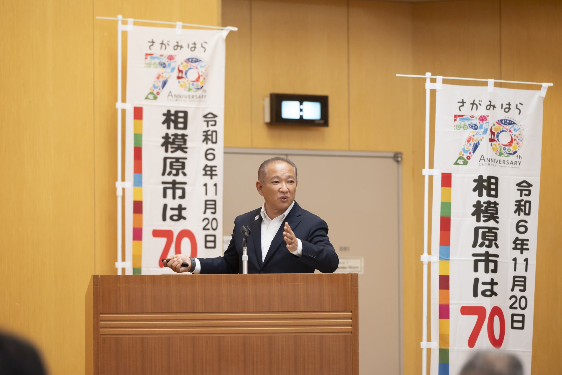 本村 賢太郎市長が登壇し、開会あいさつと市制施行70周年記念事業及び本市の魅力を紹介。その後公開開始したばかりの「相模原市70周年記念RAP動画」(約4分)をお披露目しました。