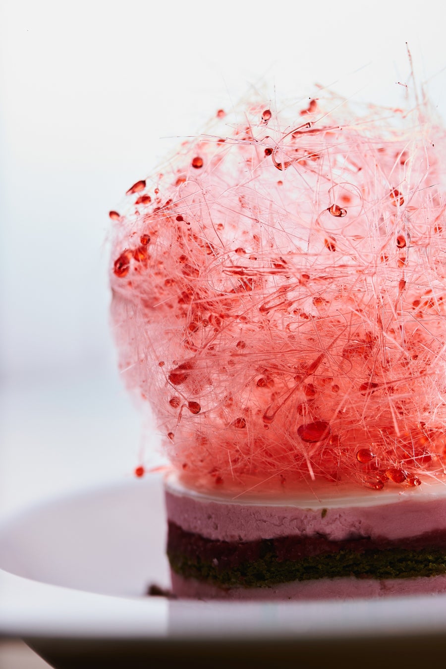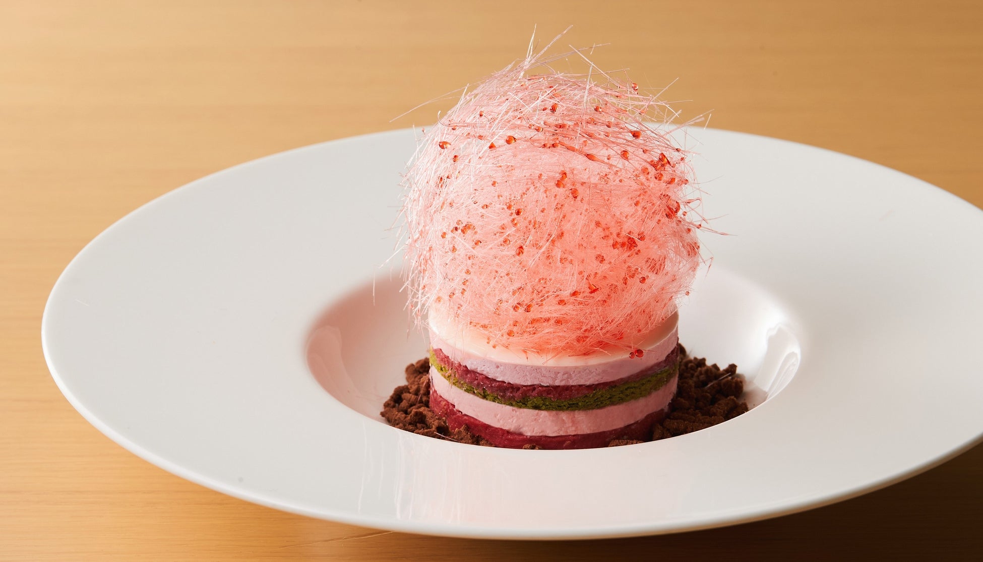 満開の桜をモチーフにした春季限定のケーキ。華やかな桜と可憐に舞い散る桜の花びらを繊細な飴細工で表現しました。6層からなるケーキの上層は、桜の香りを添えたバタークリーム。続くいちごガナッシュの層では、チョコレートの甘みをしっかりと効かせました。その下には、抹茶のジョコンドにくるみを混ぜ込み、ざくざくとした食感を演出。さくら、いちご、抹茶と3層に仕上げた生地を2度重ねることで、香りと甘味のハーモニーをお楽しみいただけます。