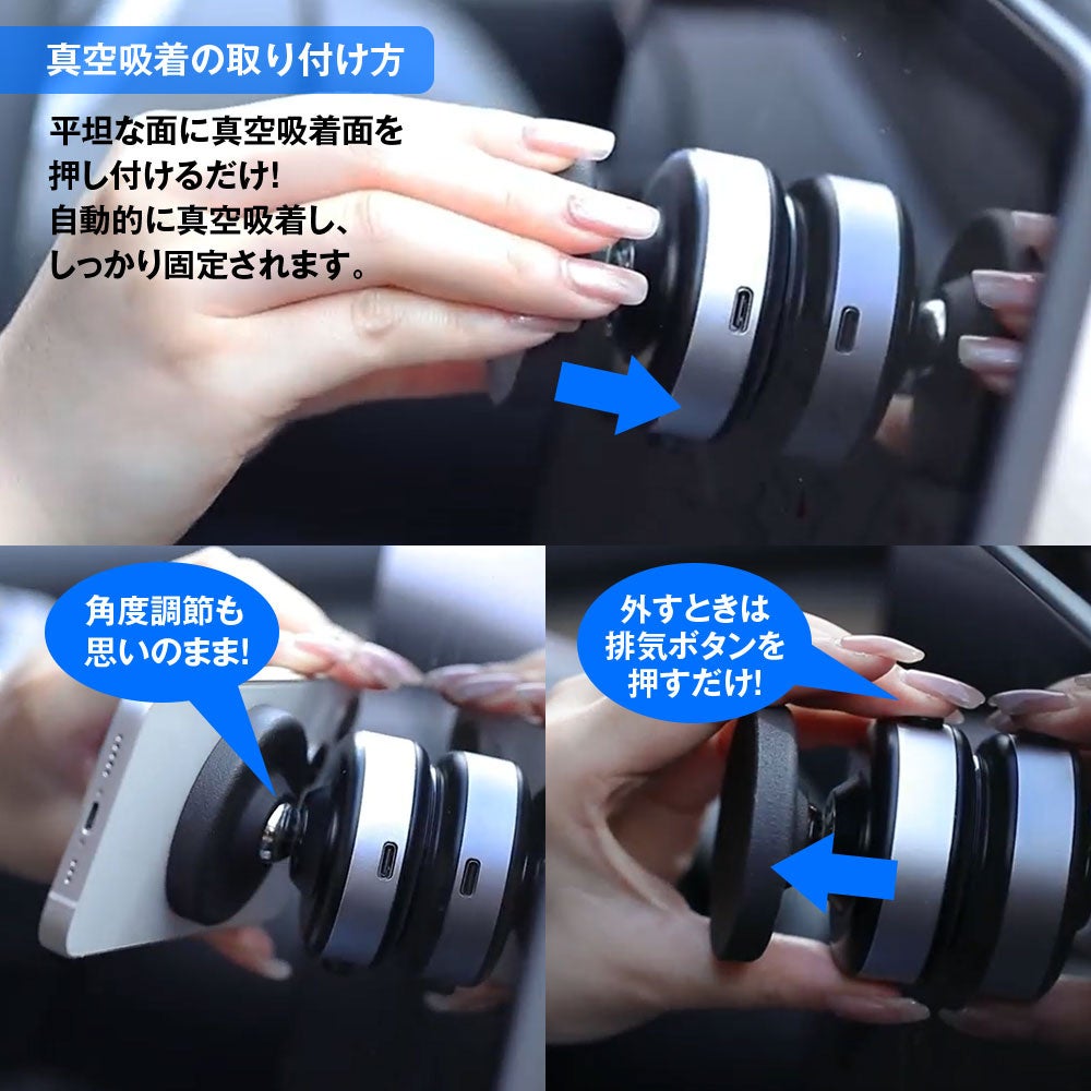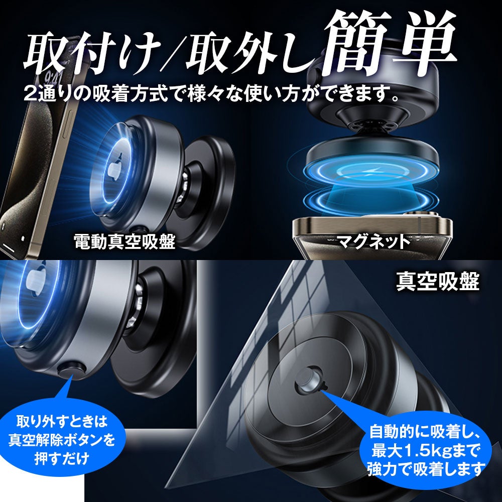 「ポン付け」で真空吸引がスタート。電動で自動的に吸着し、最大1.5kgまで強力で吸着します。取り外すときは真空解除ボタンを押すだけです。