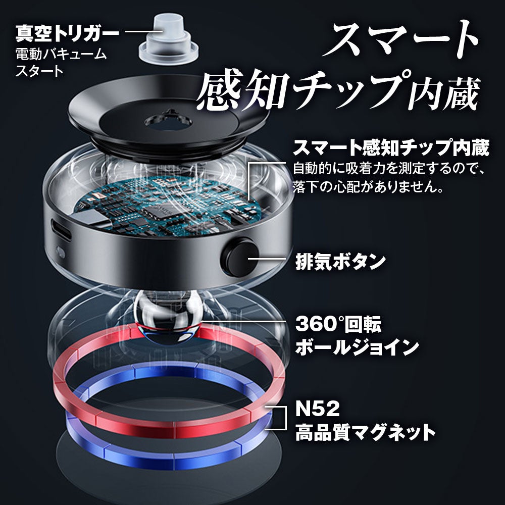 スマート感知チップ内蔵なので、自動的に吸着力を測定、最大1.5kgまで強力な吸着力を保ちます。