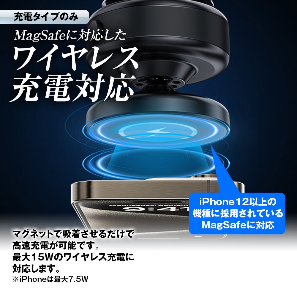 iPhone 12以上の機種に採用されているMagSafeに対応。マグネットで吸着させるだけで高速充電が可能で最大15Wのワイヤレス充電に対応します。※iPhoneは最大7.5W