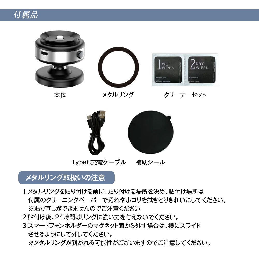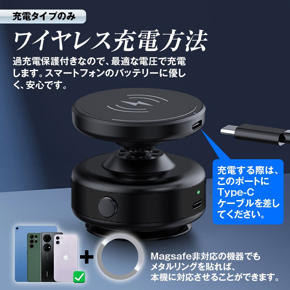 最適な電圧で充電し、スマホのバッテリーに優しく過充電保護付き。iPhone11以下の機種やXperia 10/SAMSUNG GalaxyS9、Note 8/Google Pixelなどはメタルリングを貼れば、本機に対応させることができます。