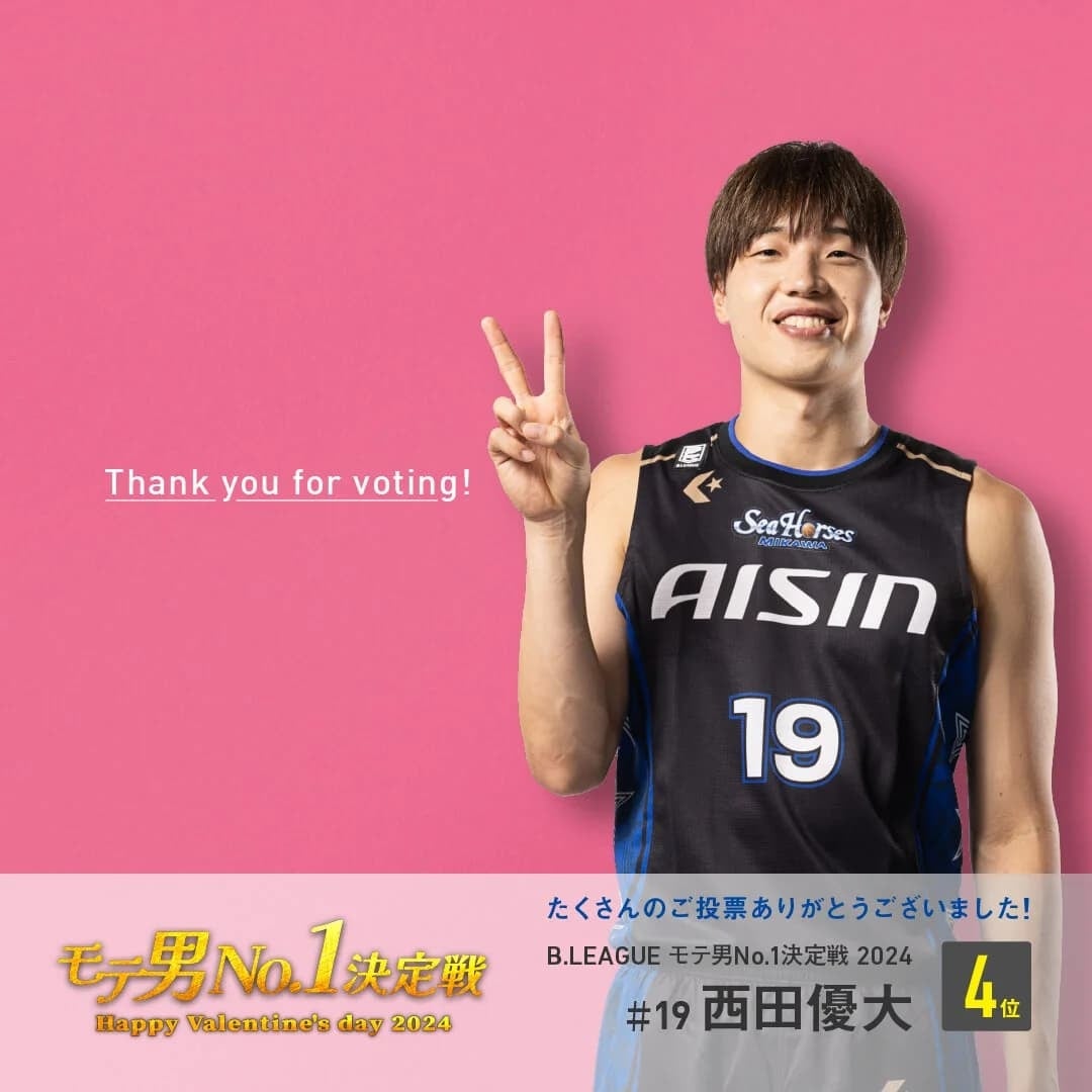 2月3日(土)~11日(日)にかけて実施された「B.LEAGUE モテ男No.1決定戦 2024」の結果が発表され、#19 西田優大選手が43,962票を獲得し、全体4位となりました。
