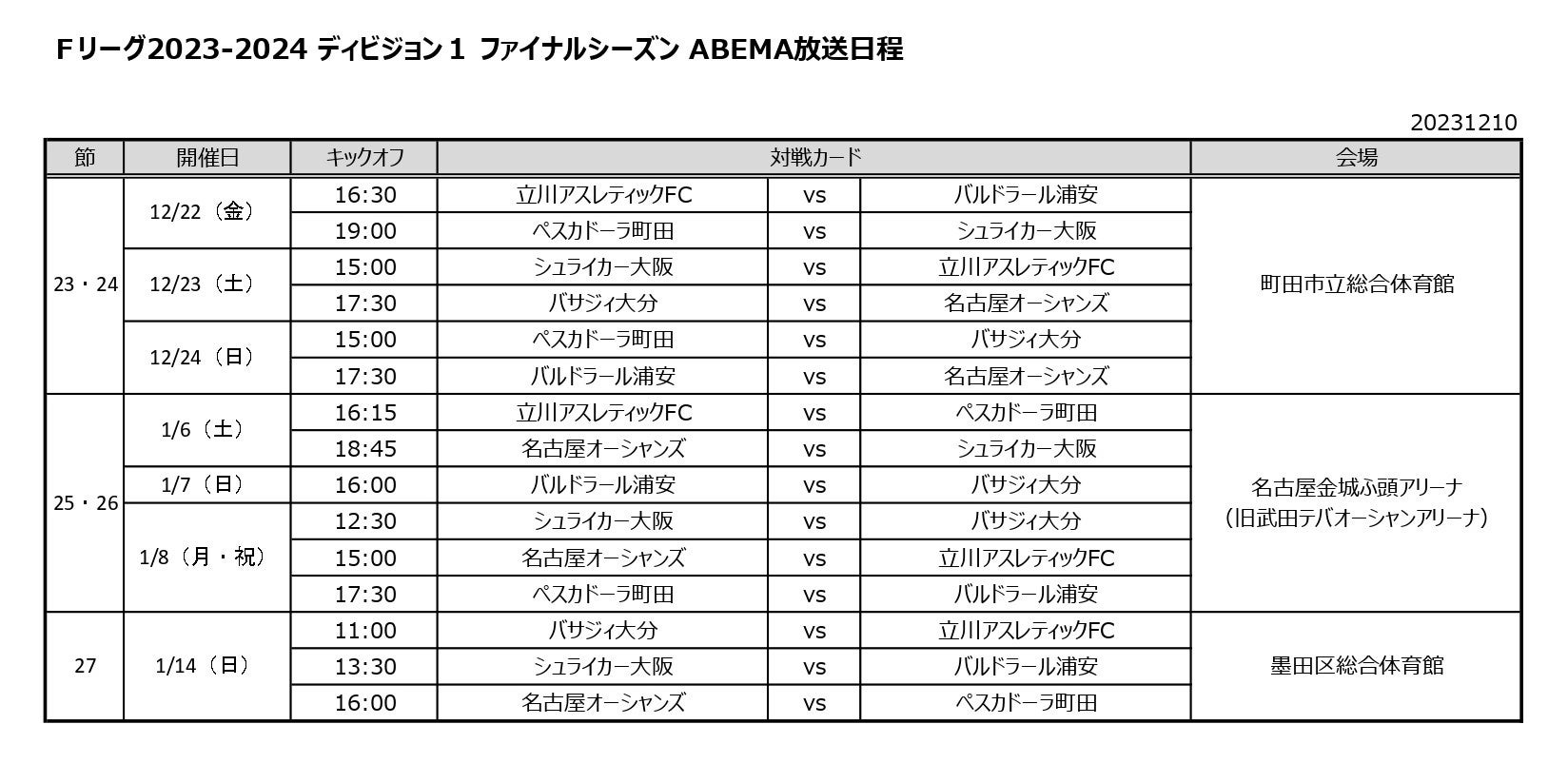 日本フットサルリーグ(以下、Fリーグ)は、12月22日(金)から開催するFリーグ2023-2024 ディビジョン1 ファイナルシーズンにおいて、ABEMAで生中継する試合が決定いたしましたのでお知らせいたします。