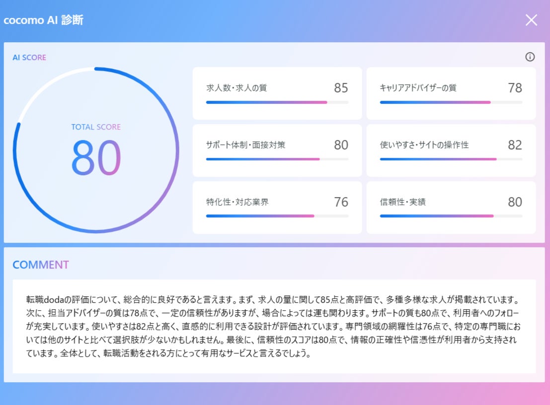 独自開発の「cocomo AI」が、各転職サイトを6つの観点で数値化。客観的な指標をもとに、ユーザーが直感的に比較できるようになりました。