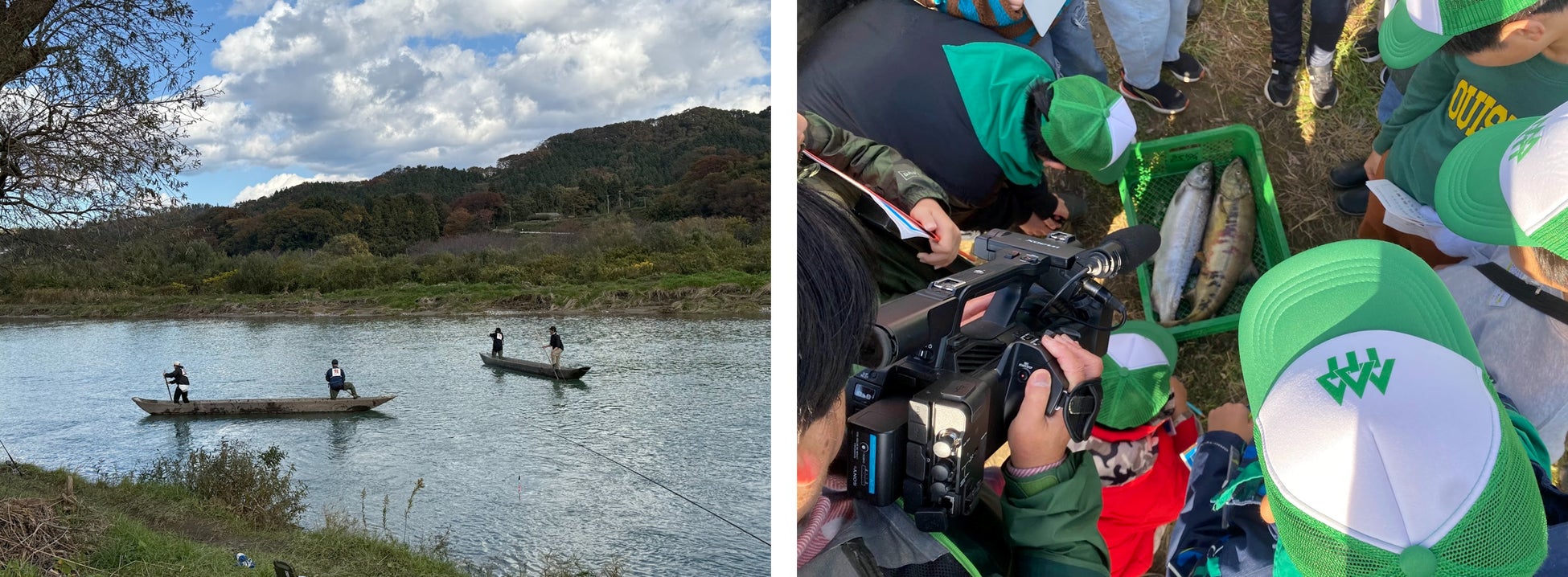 三面川鮭産漁業協同組合の佐藤克雄組合長から、鮭の生態や特徴のほか、近年の鮭漁についての説明を受けました。三面川では、10年前は50,000匹以上を漁獲していましたが、近年の漁獲量はその10分の1にまで減少。今年に至っては11月10日現在、わずか39匹とのことでした。不漁の要因の一つに、地球温暖化による海水温の上昇があることを子どもたちは学びました。鮭が捕れるか不安な中、居操網漁とウライ漁で計4匹の鮭を捕獲する現場に立ち会うことが出来ました。子どもたちは、捕れたばかりの鮭に手で触れるなどして興奮した様子でした。