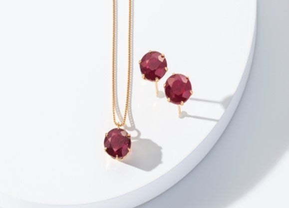 繊細なカットがほどこされた石を使用し、まるで万華鏡のように光彩豊かにキラキラと美しい輝きを放つジュエリーを展開しているブランド。今回は深紅の美しさが際立つルビーのネックレスとピアスが登場します。