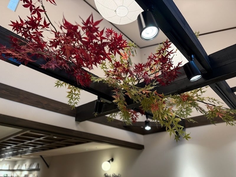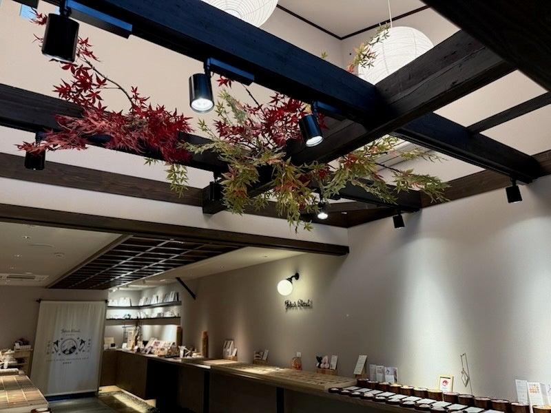 京都産寧坂店では、晩秋の京都をイメージした空間演出に刷新。店内の吹き抜け部分から流れるようにされたディスプレイは、紅葉のグラデーションや建具の木の質感で、秋の情景を表現しています。