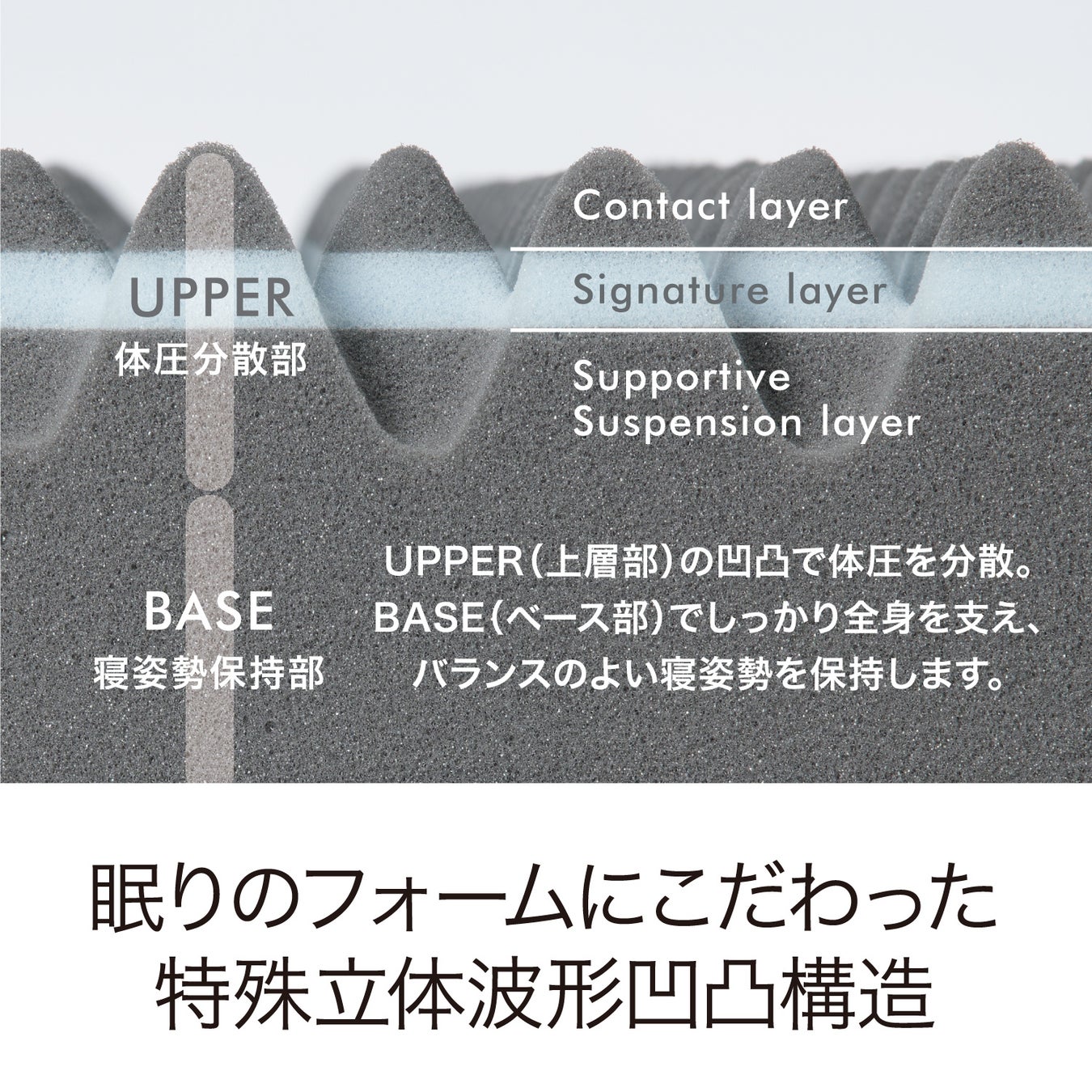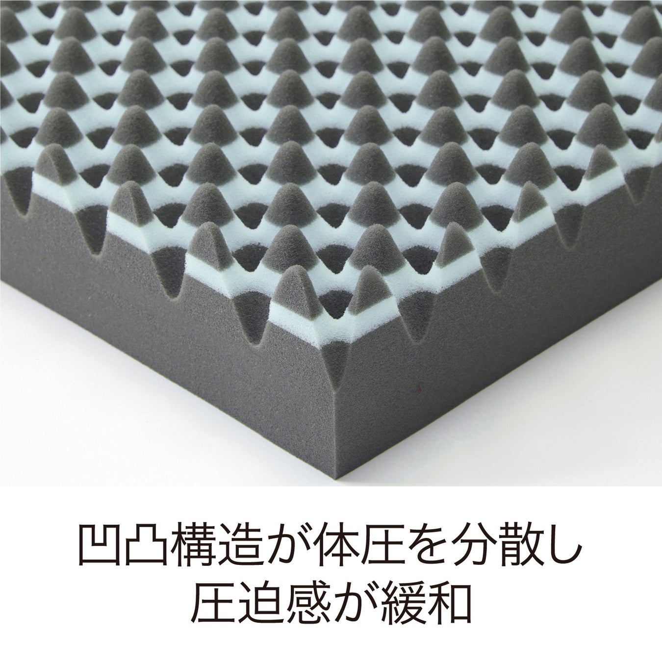 [エアー01]BiZマットレスは、眠りのフォームにこだわった特殊立体波型凹凸構造。敷き寝具に求められる「体圧分散性」「寝姿勢保持性」の機能を高めることで、快眠をサポートします。