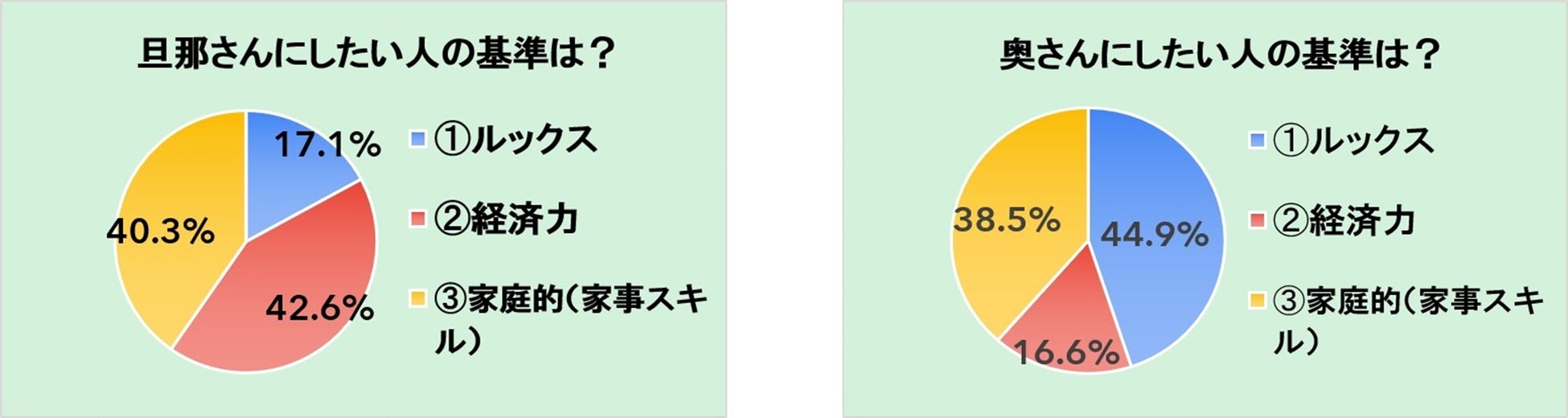 ”旦那さんにしたい”相手に求める基準では、最も重視する点は「経済力」、次いで「家庭的(家事スキル)」となり、「ルックス」は優先度が低いという回答結果が。”奥さんにしたい”相手には、家事をする男性も増えてきたので「家庭的(家事スキル)」よりも「ルックス」が高い結果に。また、”彼女にしたい”相手より経済力の比率が上がっているのは、いざ夫婦生活を考えたときに共働きを求めるからかも知れません。