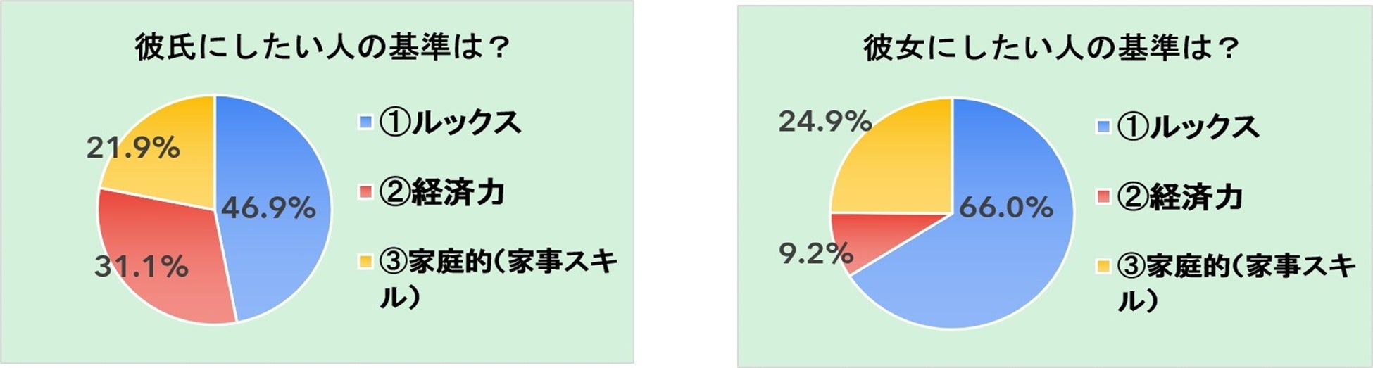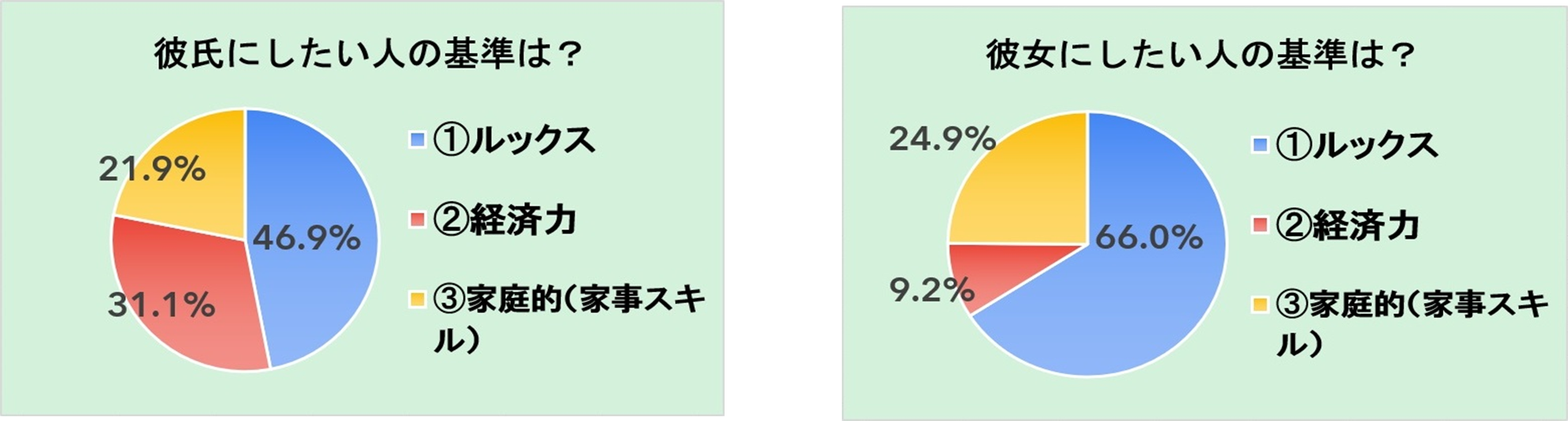 一方、”彼氏にしたい”相手には「ルックス」が重視なもののバランスよく求める傾向があり、”彼女にしたい”相手には圧倒的に「ルックス」が重視されるなど、それぞれの立ち位置でお相手に求める基準が顕著に異なるという結果となりました。