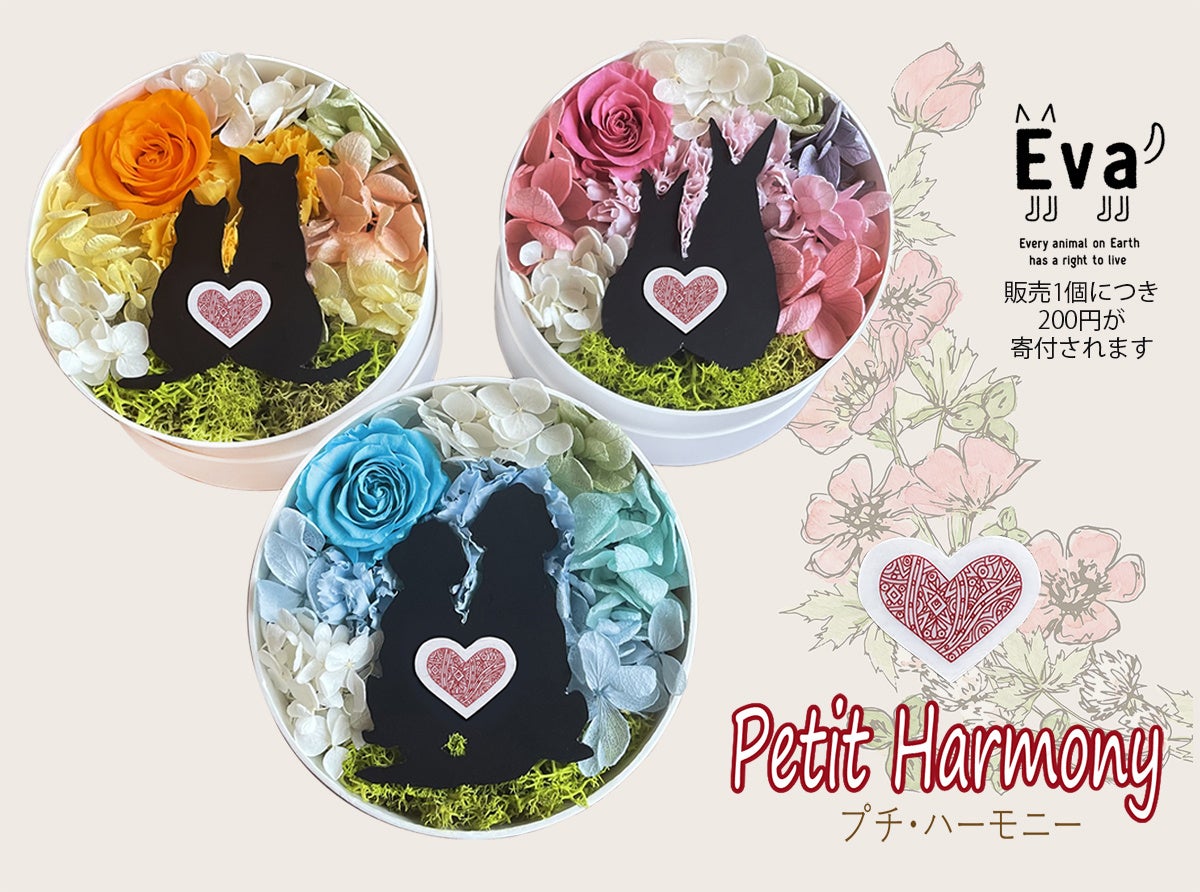 どんな大きな社会の変化も一人ひとりの想いの重なりから生まれます。動物のための、動物にやさしいフラワーアレンジメントを作れないかという想いから企画した、寄り添う2匹の動物が印象的なプリザーブドフラワーアレンジメント「petit harmony(プチ・ハーモニー)」。