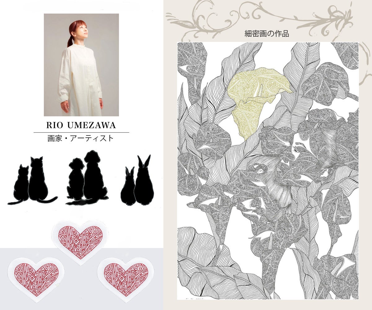 選べる動物は、犬、猫、うさぎの3種類。親子にも、友だちにも、恋人のようにも見える2匹の動物が仲良く寄り添うシルエットが印象的なデザインで、お互いの想いが重なったところをひとつのハートで表現。動物のシルエットとハートの中の細密画はRIO UMEZAWAさんによる手書きデザインで、アクリルと印刷で表現しています。