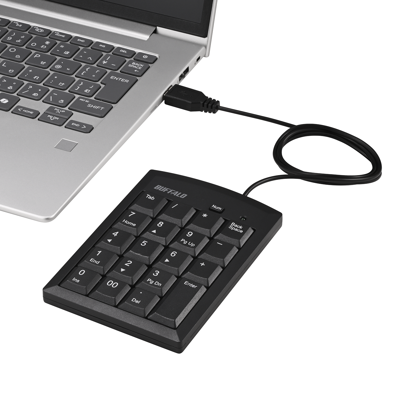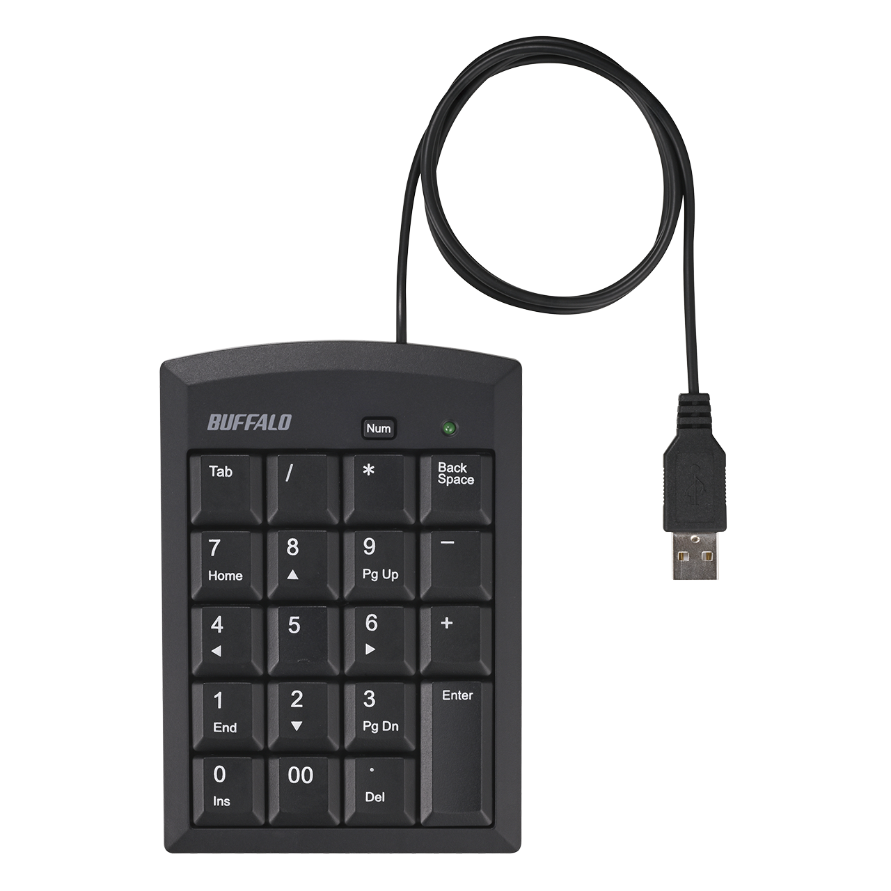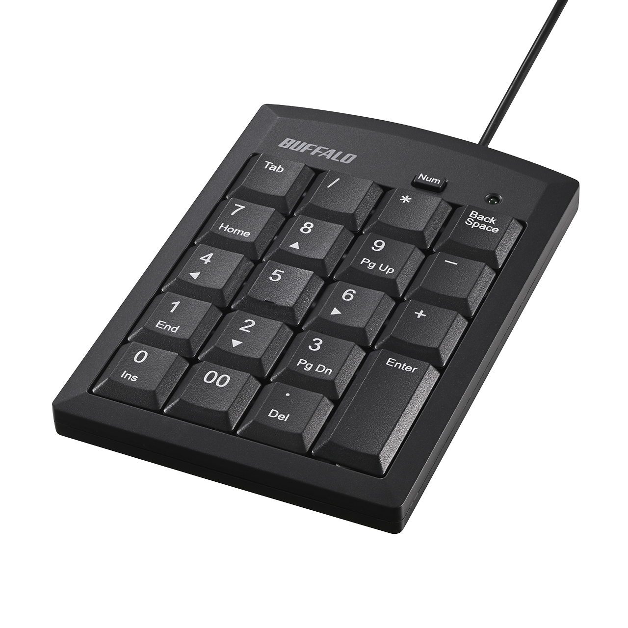 本商品はExcelでのセル移動や関数選択がスムーズになる「Tab」キーと、高額入力時に便利な「00」キーを搭載した有線テンキーボードです。