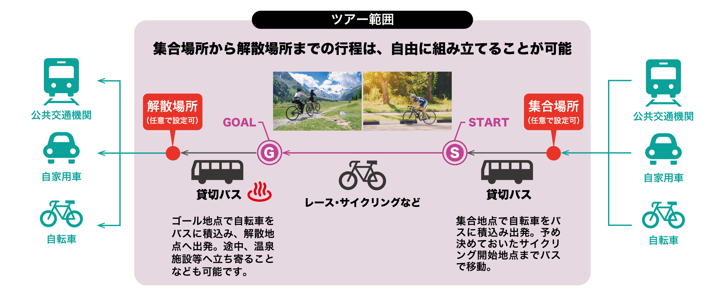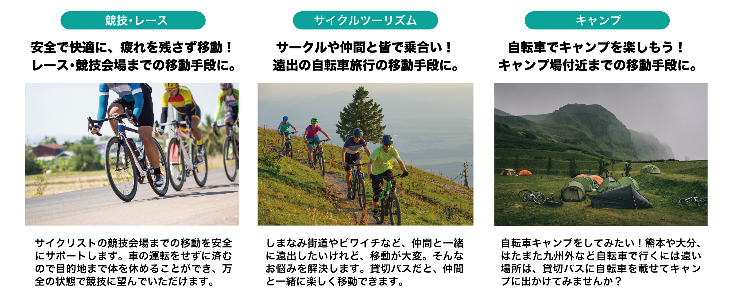 近年環境にやさしく、健康にも良いとして再注目されている自転車ですが、西鉄バス二日市では、観光バスに大切な自転車と一緒に移動できる安心の設備“BTB輪行箱”を整えることで、プロチームのレース会場までの移動や、風光明媚なスポットでのサイクルツーリズム、サークル仲間との自転車旅行など、サイクリストの移動に関する様々なニーズにフレキシブルにお応えしていきます。プロの選手から一般の方まで、幅広くお使いいただけます。