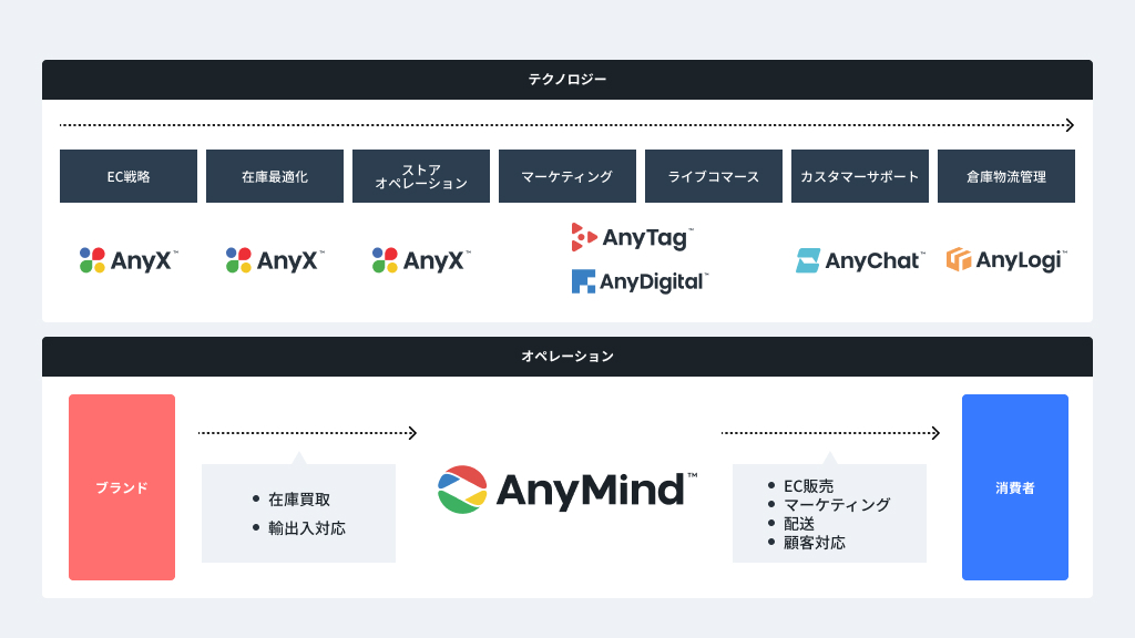 ECマネジメントプラットフォーム「AnyX」はECモールや自社ECサイトなど、複数の販売チャネルを一元管理することで、EC運営を支えるECマネジメントプラットフォームです。業務効率化×データ活用、豊富な実績を元にした運用支援、各国・市場のローカルの知見を生かした越境展開・海外販売まで、EC事業の成長に向けた幅広いソリューションを提供します。