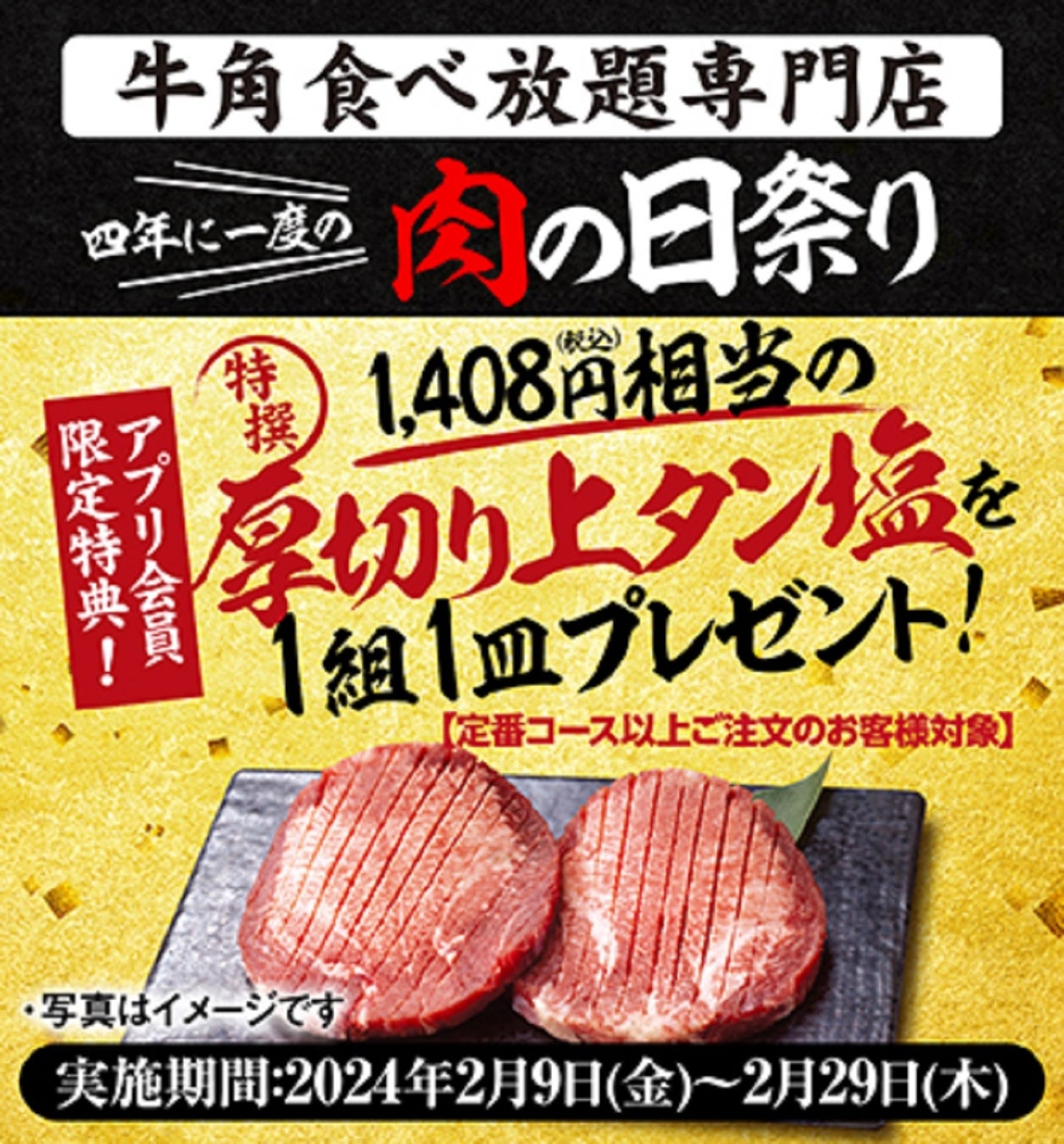 牛角公式アプリ会員限定で「四年に一度の肉の日祭り」開催!