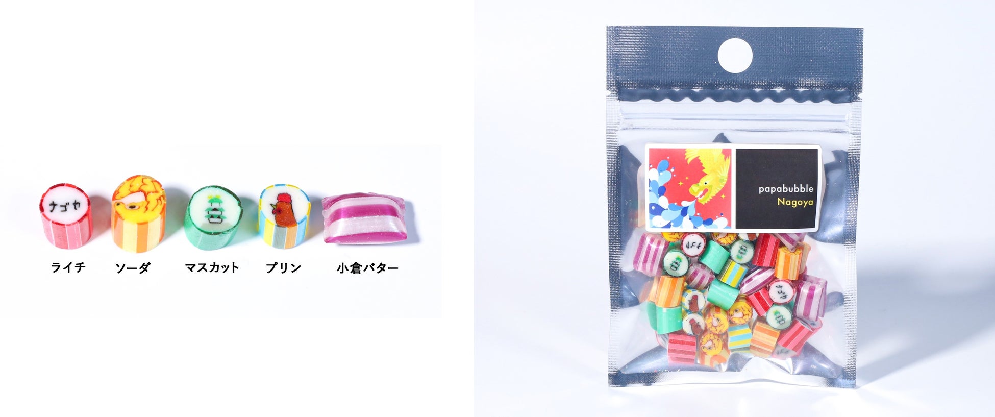 「しゃちほこ」「名古屋城」「名古屋コーチン」といった、名古屋といえば!のアイテムを絵柄にしました。枕型のキャンディはモーニングでも有名な「小倉バター」を再現し、1袋でさっぱりと濃厚の両方を楽しめる味に仕上げています。火除けの守り神である、躍動感のあるしゃちほこのキャンディとラベルにぜひご注目ください。