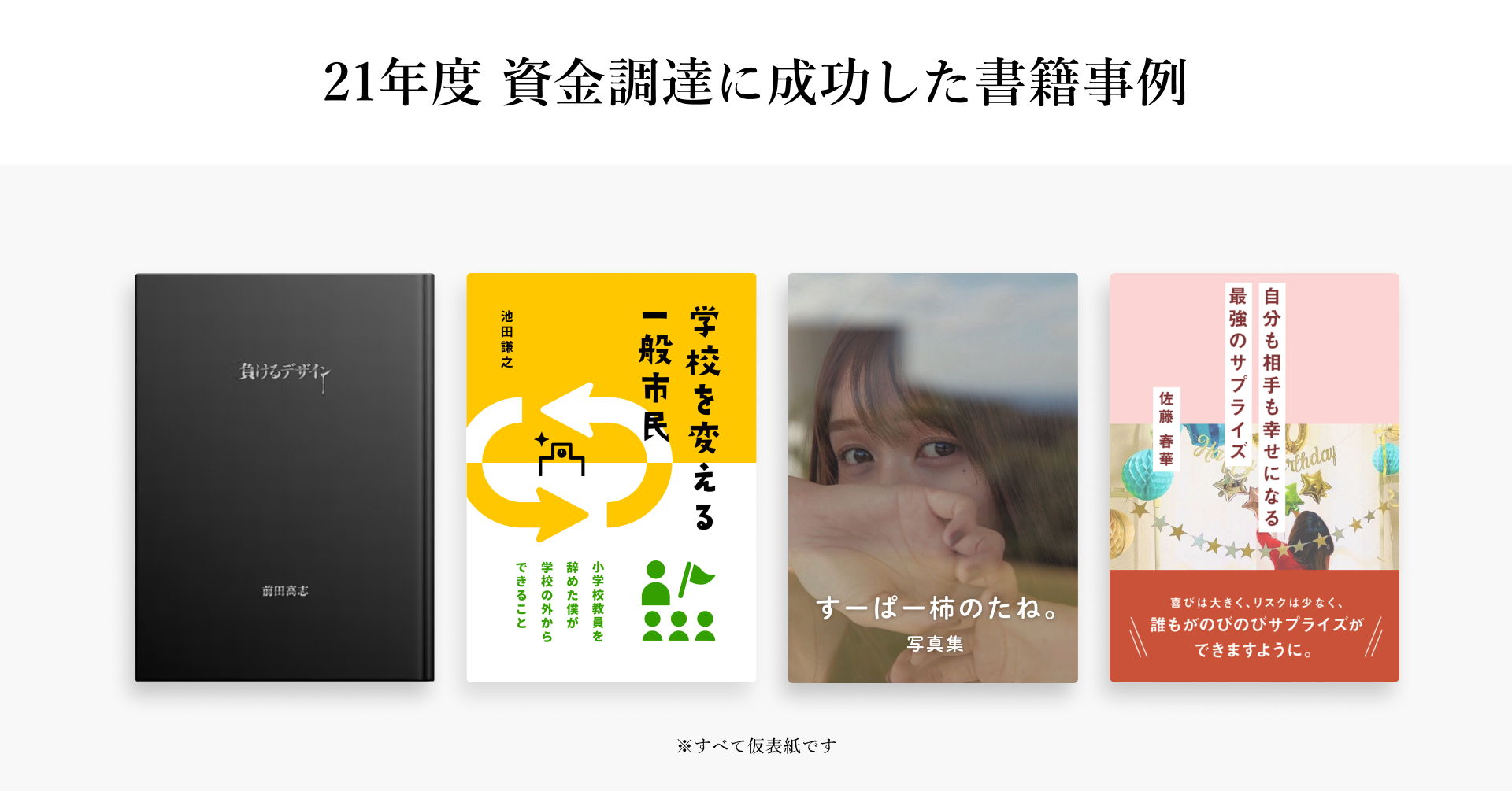 CAMPFIREは、2019年5月13日より出版クラウドファンディング「EXODUS」の提供を開始、これまで16冊以上の作品を出版し、さまざまな個人や作家の挑戦を応援して参りました。クラウドファンディングの活用により、1000部の読み手がいれば出版できる仕組みを構築し、本を最適な読者に届けるための支援活動に取り組んでいます。自費出版でありながら、担当編集者がつき、装丁などのデザインワークや校正・校閲作業などのサポートも受けることができ、従来の商業出版と同様のクオリティで出版することができます。