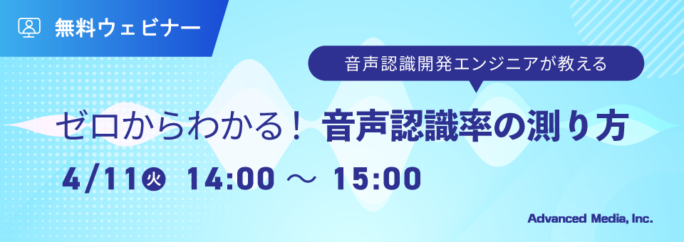 2023年4月11日(火)、株式会社アドバンスト・メディア(本社:東京都豊島区、代表取締役会長兼社長:鈴木清幸 以下、アドバンスト・メディア)は、オンラインセミナー「音声認識開発エンジニアが教える ゼロからわかる!音声認識率の測り方」を開催いたします。