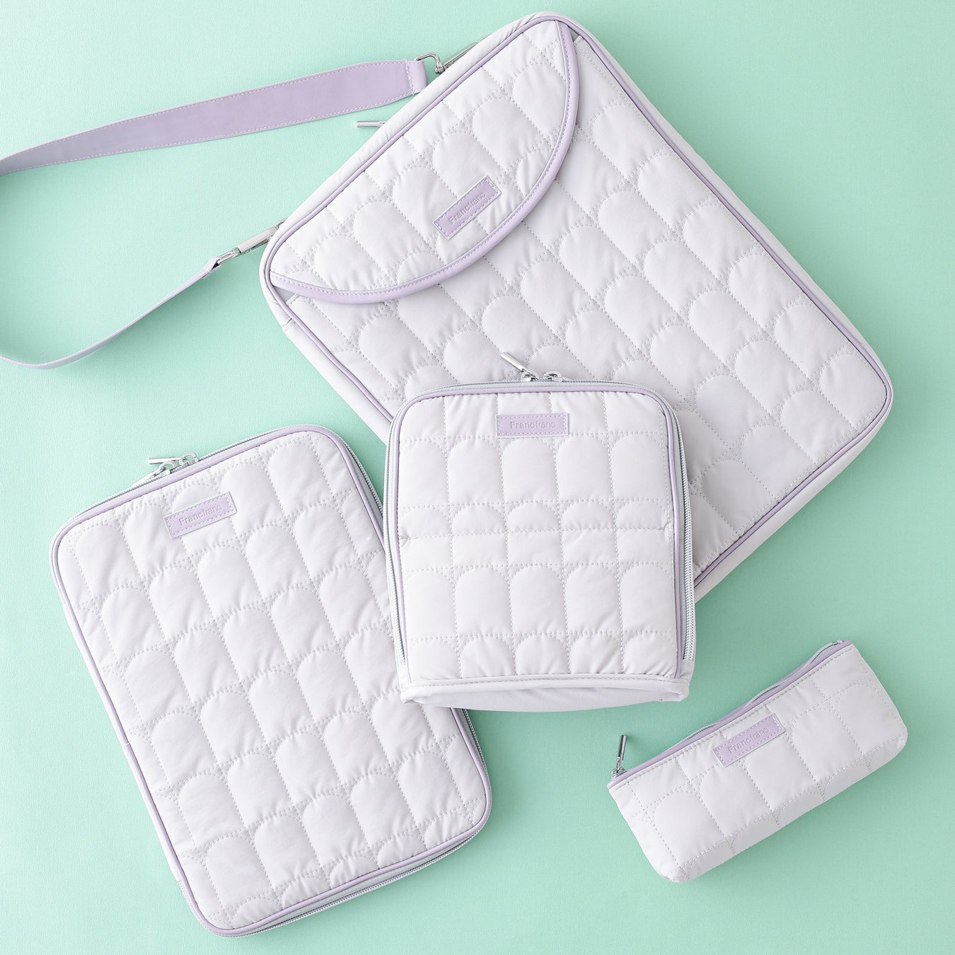 アーチ模様のキルティングデザインがトレンドライクなPCケースです。取外し可能なショルダー付きで気軽に持ち運べます。