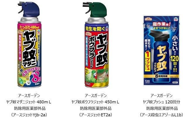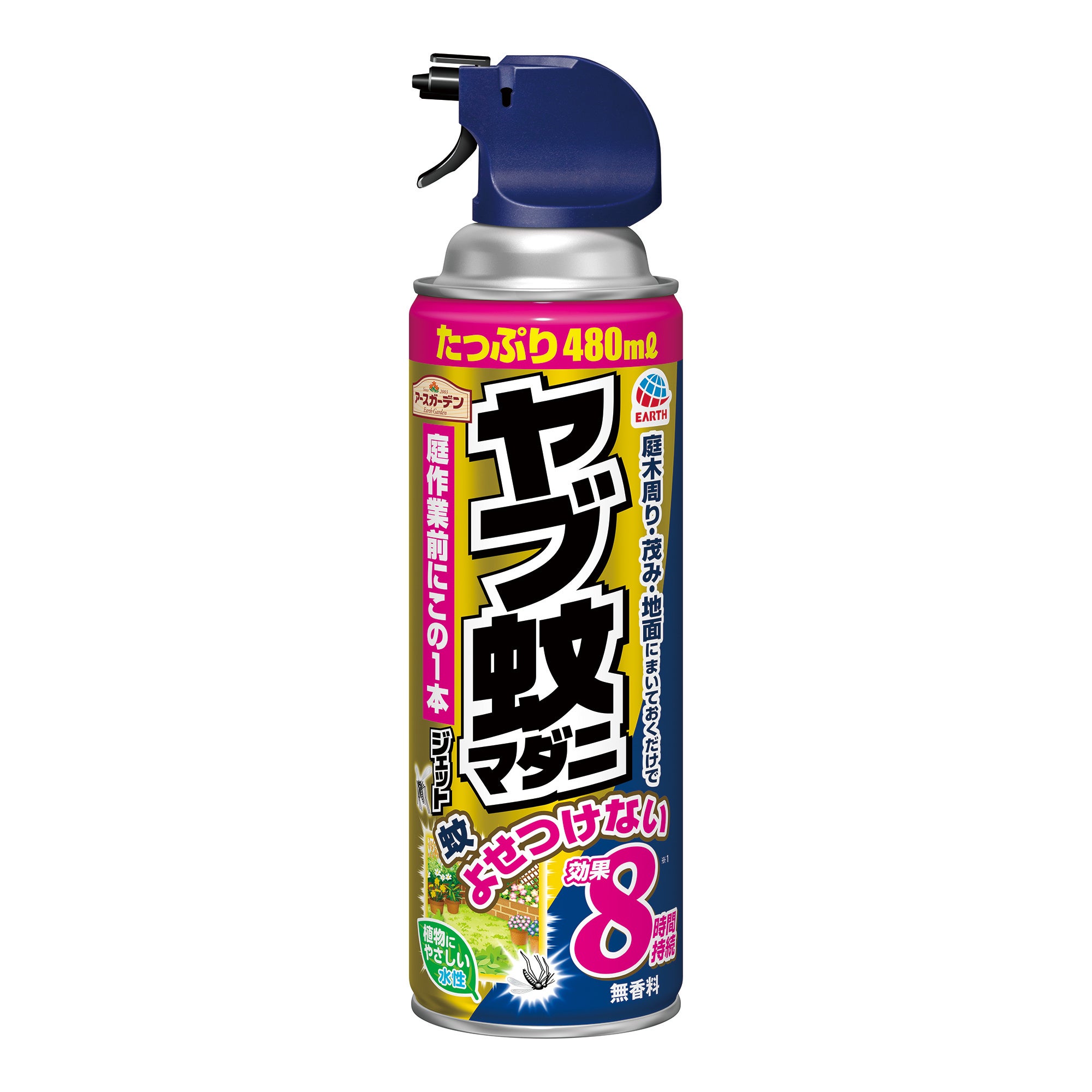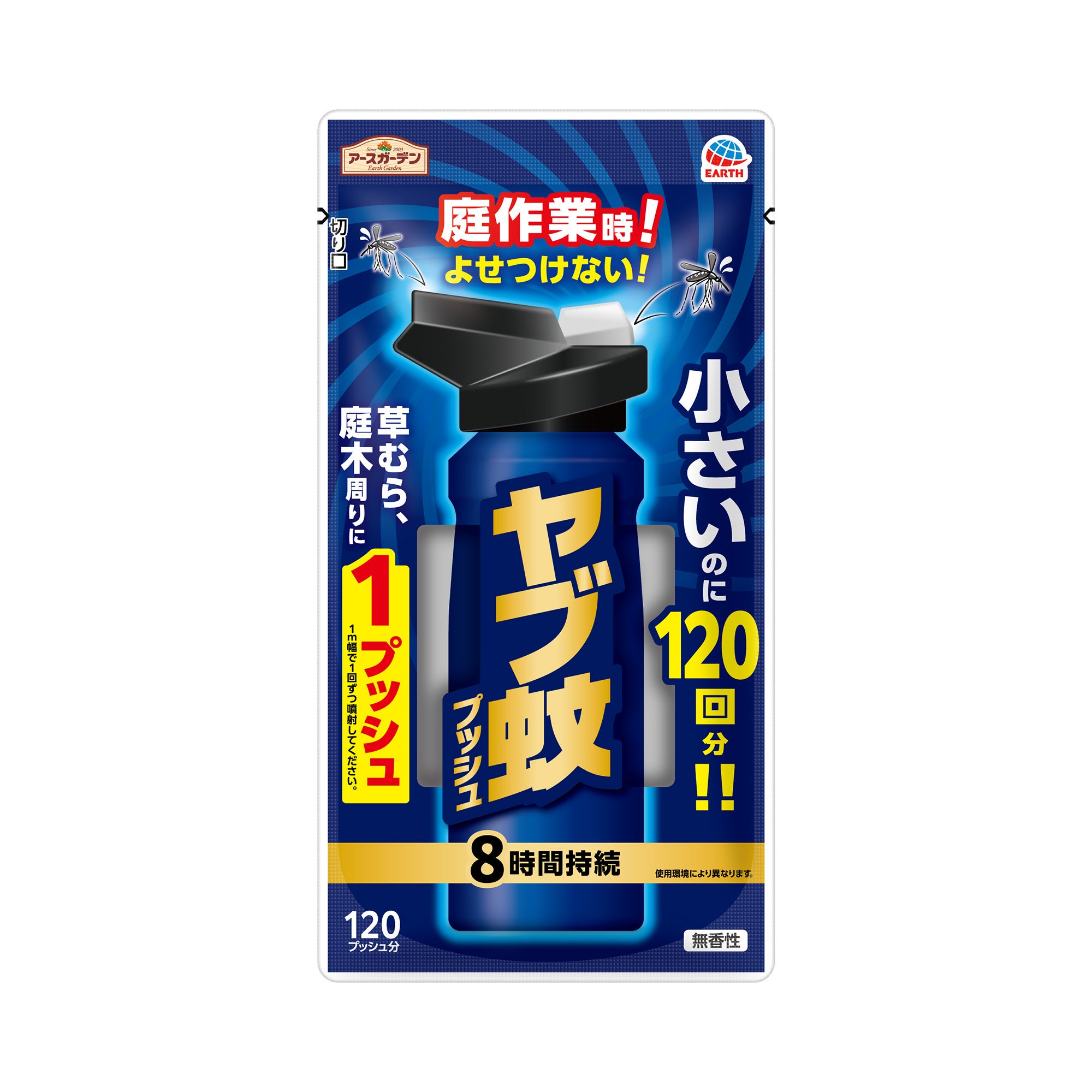 当社では、園芸用ヤブ蚊対策として、3製品をご用意しています。直接駆除や発生源を対策したいときは、ヤブ蚊・マダニを駆除する『アースガーデン ヤブ蚊マダニジェット 480mL』、ヤブ蚊・マダニに加え、ボウフラを駆除する『アースガーデン ヤブ蚊ボウフラジェット 450mL』がオススメです。手軽に広範囲で使用したいときには、噴射するだけでヤブ蚊を駆除し、約8時間よせつけない(※1)1プッシュ式スプレー『アースガーデン ヤブ蚊プッシュ 120回分』をオススメします。使用環境に合わせてご使用ください。