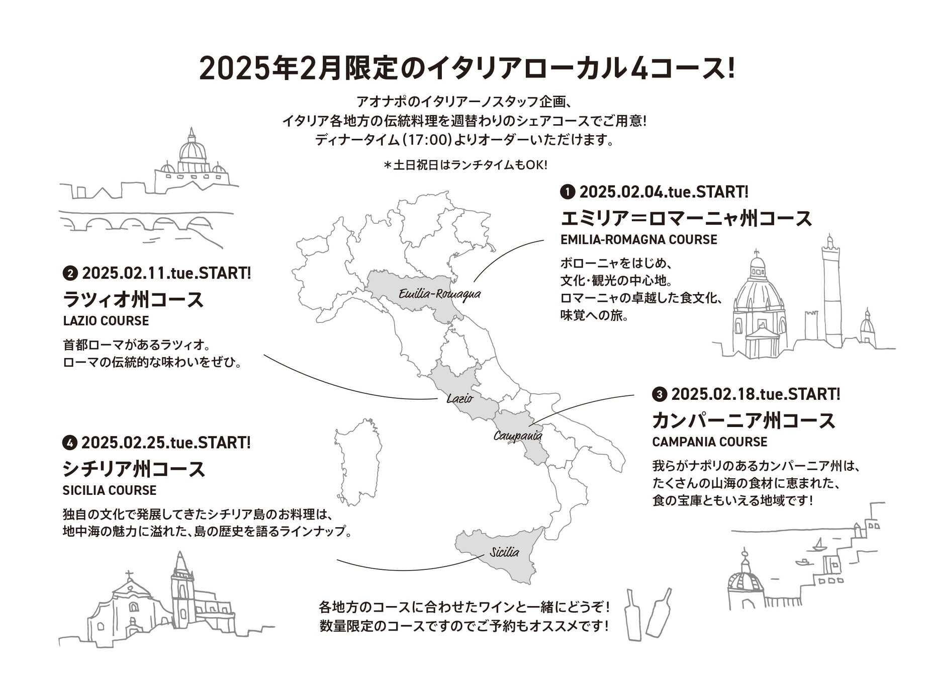 エミリア=ロマーニャ、ラツィオ、カンパーニア、シチリアの4州の料理をテーマに、2月4日(火)〜3月4日(月)の1カ月間、週替わりで提供いたします。