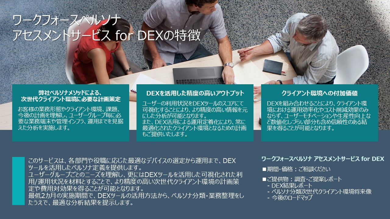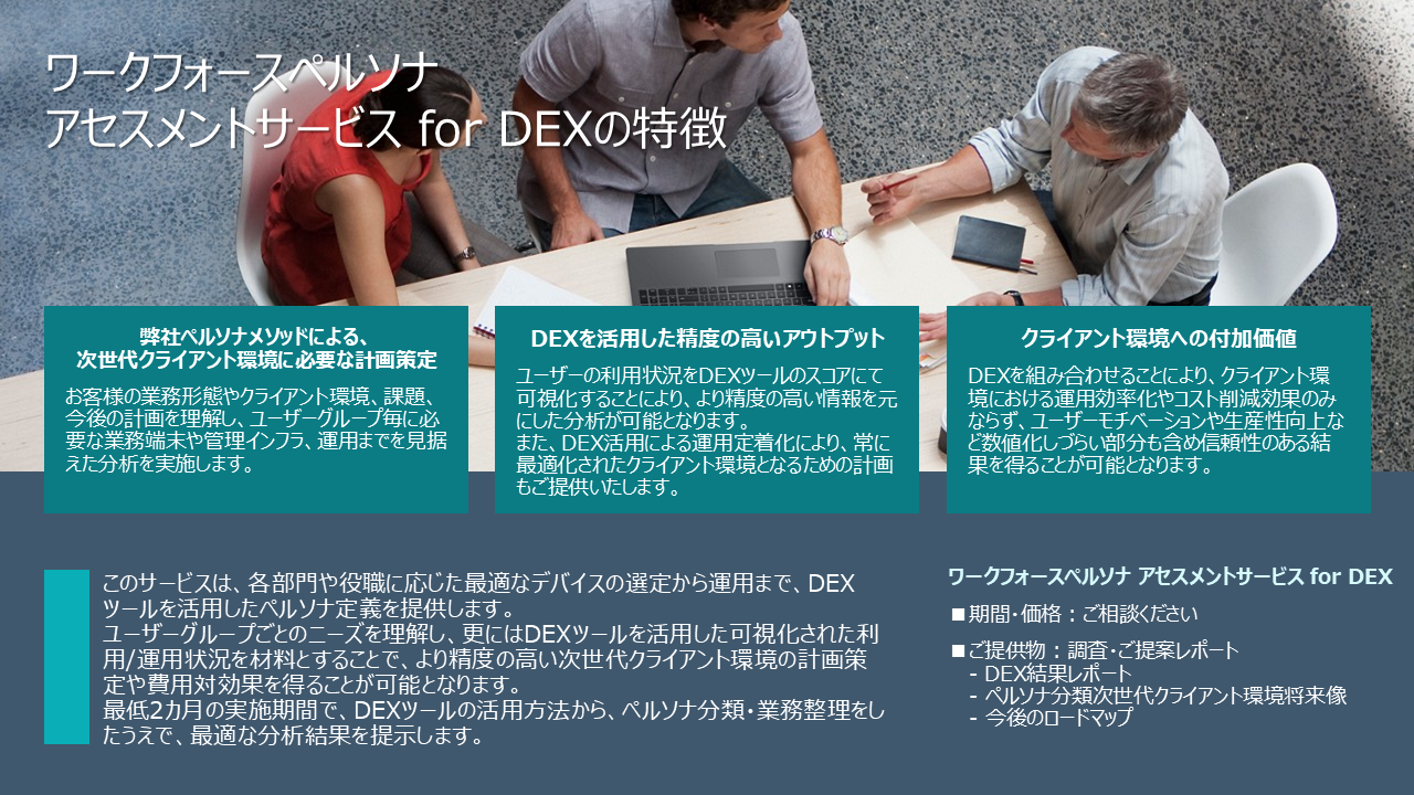 部門・役割ごとの業務特性や利用実態を分析し、DEXスコアと組み合わせて、最適なデバイス構成やクライアント環境のあり方を明確化します。これにより、次世代クライアント環境の将来像、ロードマップ、投資優先度の整理を支援し、費用対効果の高いワークプレース戦略の策定を可能にします。