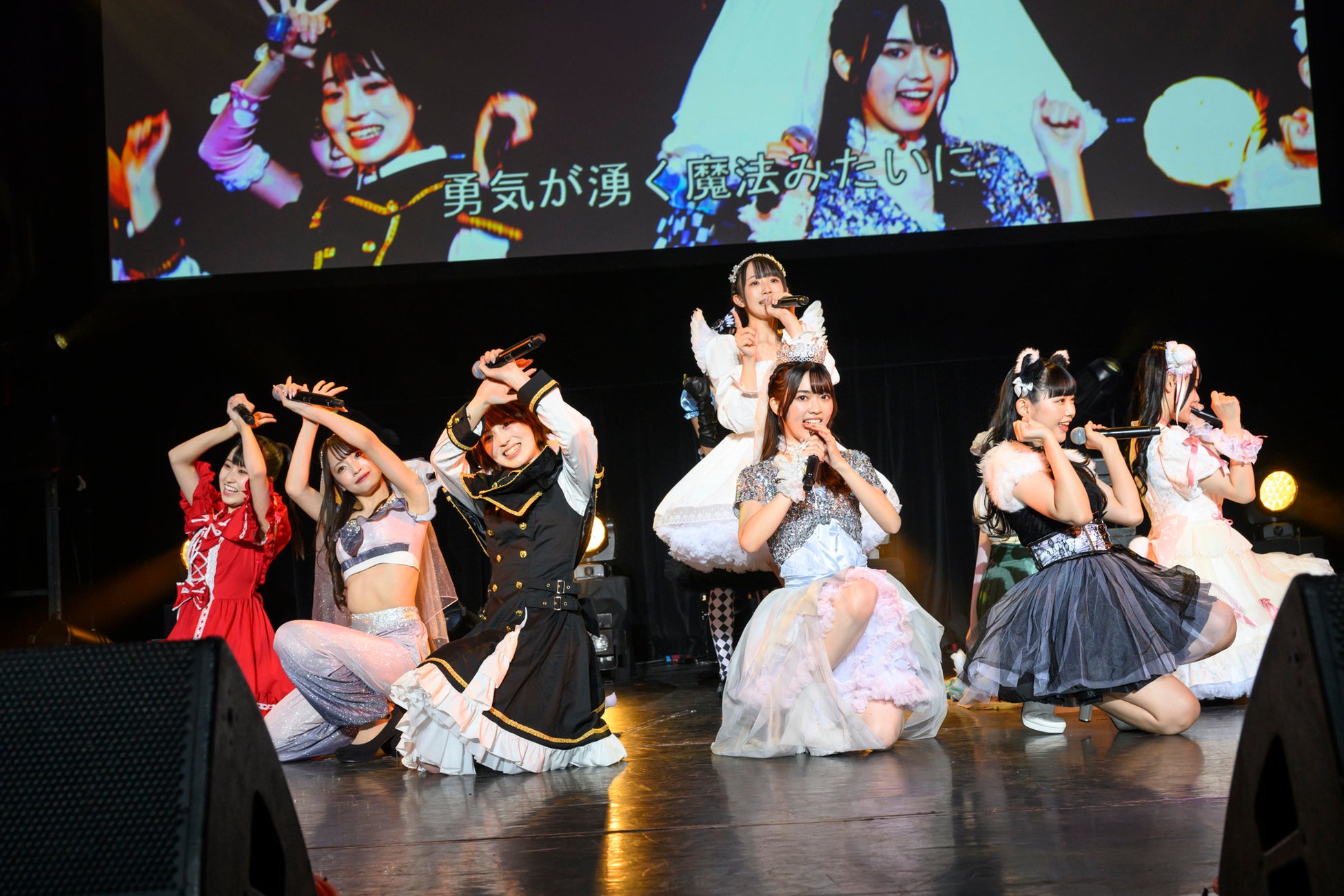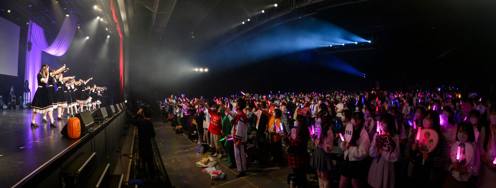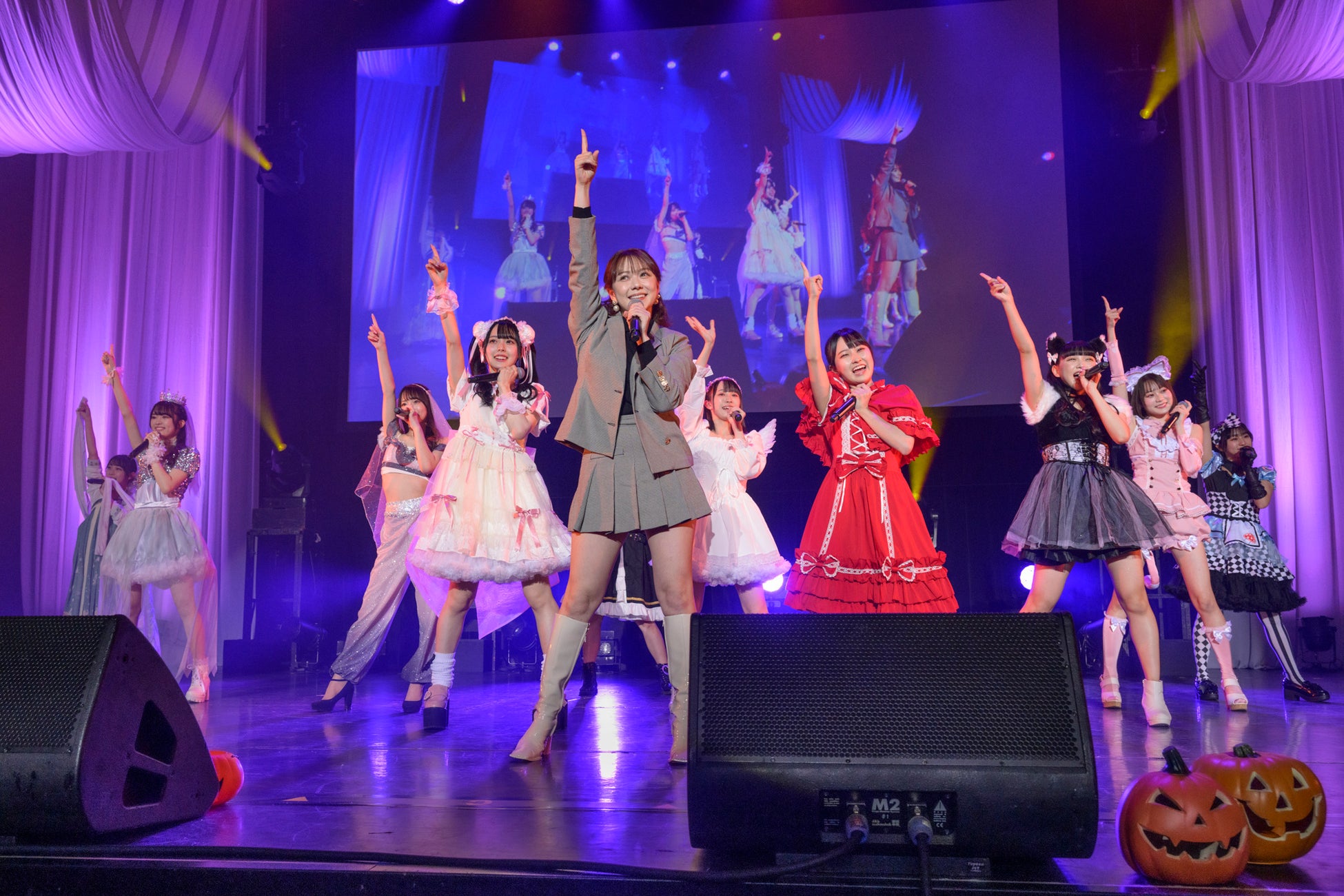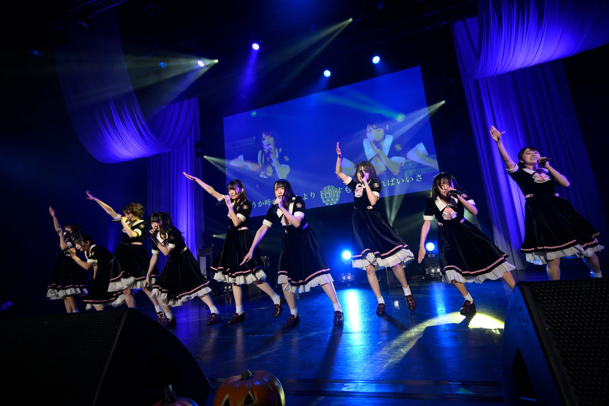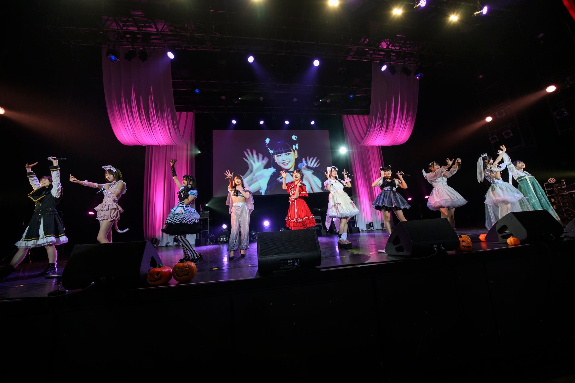 前半のハロウィンパートでは、様々な企画を展開。「いたずら顔GP(グランプリ)」と称して、「●●してくれないと、いたずらしちゃうぞ」の合言葉と共に、ステージ上のモニターに映し出されるメンバーそれぞれの可愛らしいキメ顔に大いに盛り上がる会場。そのままの勢いで「ユメムスビ」を披露。貴重な仮装姿のパフォーマンスとなった。