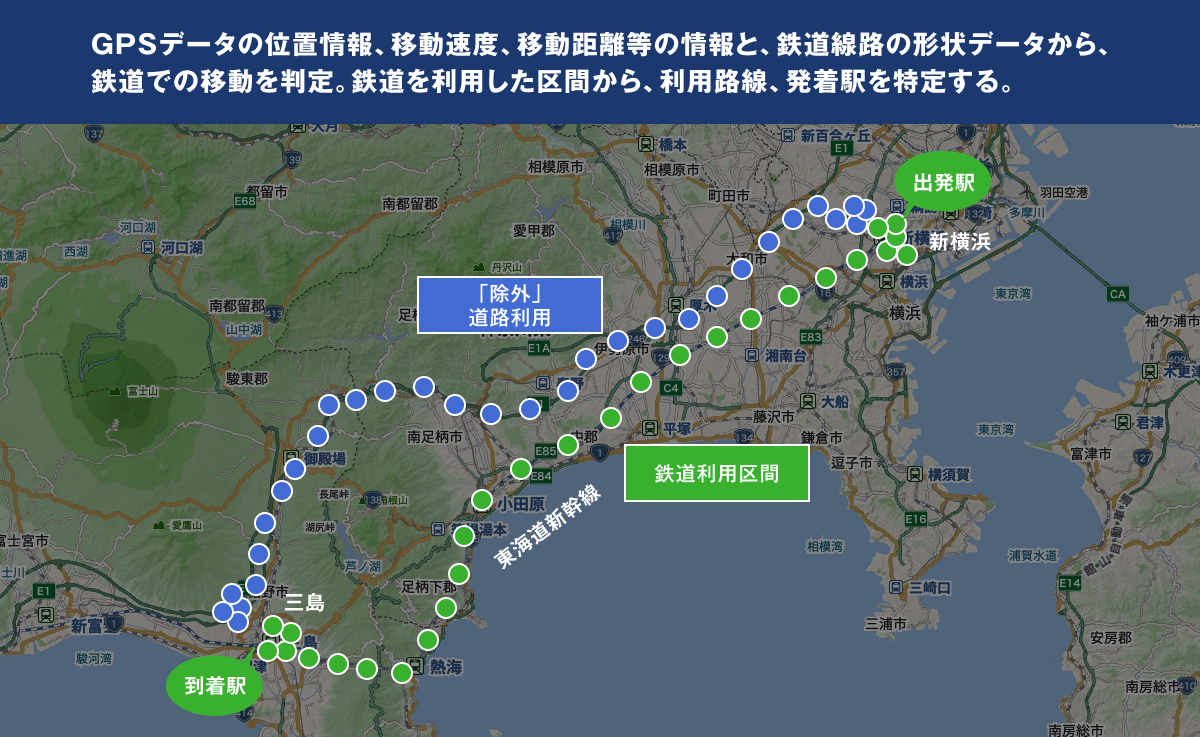 ※1 移動推定技術:緯度経度の点列情報に対し、路線形状データマッチング、速度計算を行い移動手段を推定する技術