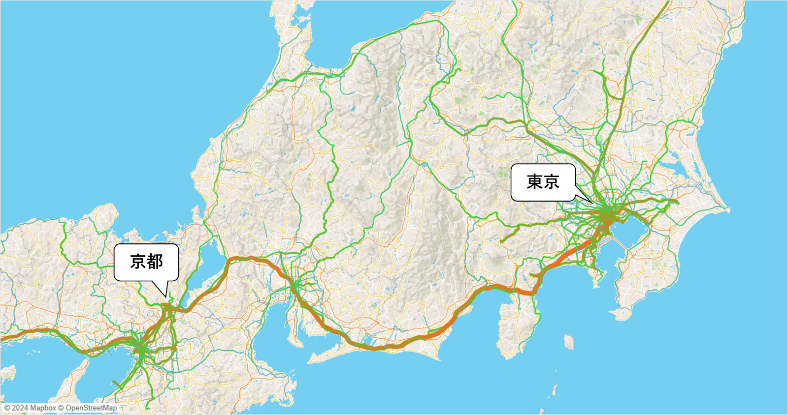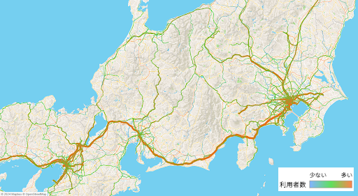 下図は2023年度の全期間の鉄道利用実績を駅区間単位で表示したものです。ゴールデンルートと呼ばれる東京⇔京都・大阪間を結ぶ東海道新幹線での往来が多いことが見て取れます。