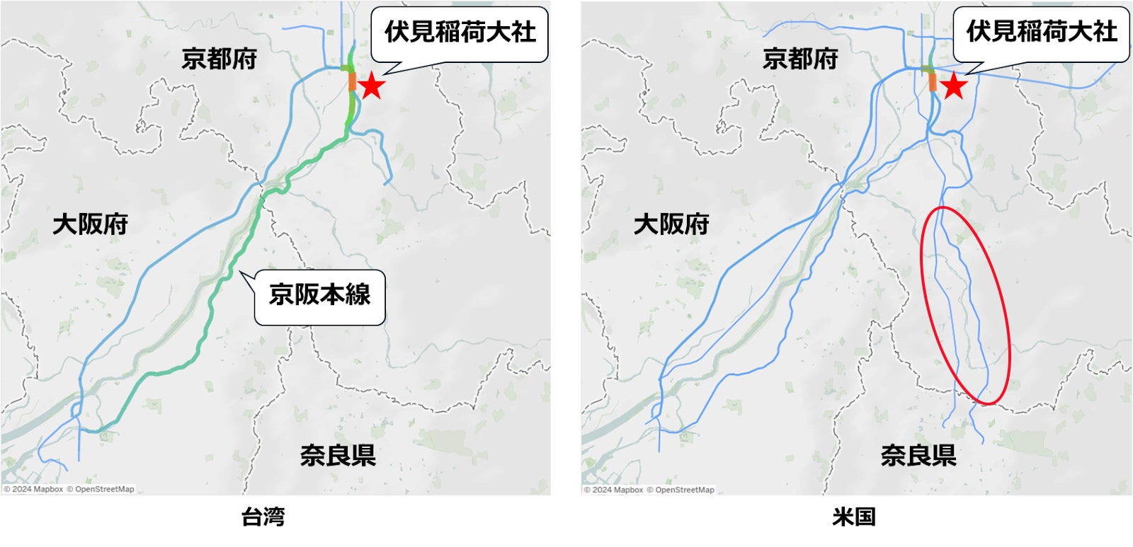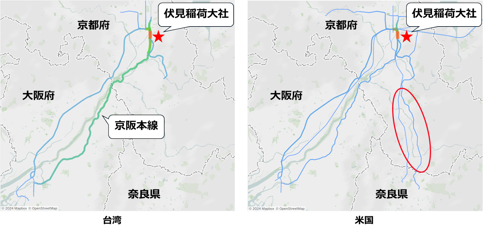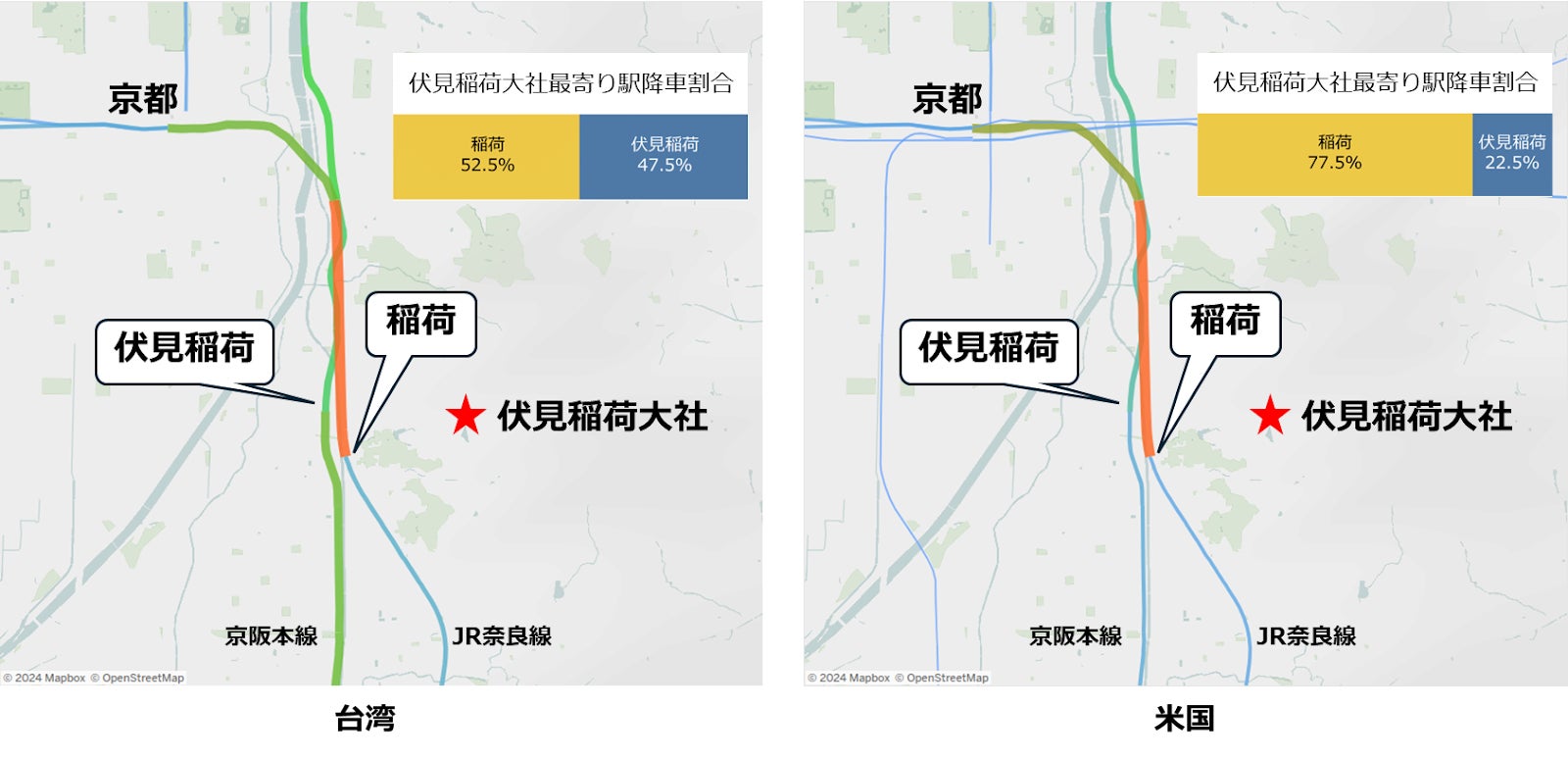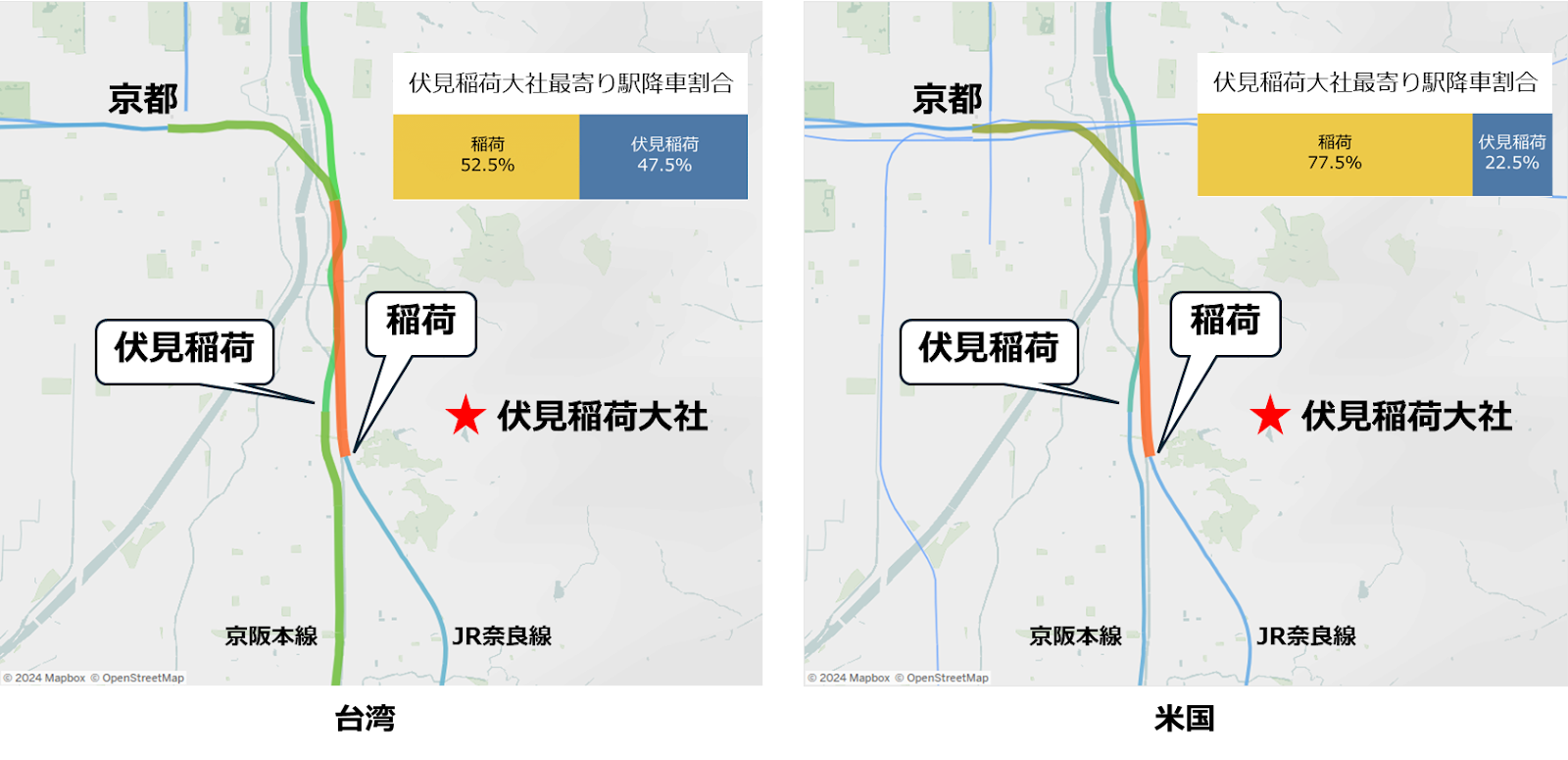 伏見稲荷大社の最寄り駅である、JR奈良線 稲荷と京阪本線 伏見稲荷で降車した台湾、米国の旅行者に着目すると以下のことがわかります。
