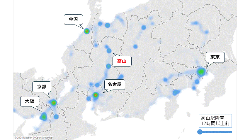 下図は、降車駅を指定し、その前後で旅行者が滞在した場所を地図上に表示したものです。高山駅で降車した旅行者に着目すると以下のことがわかります。