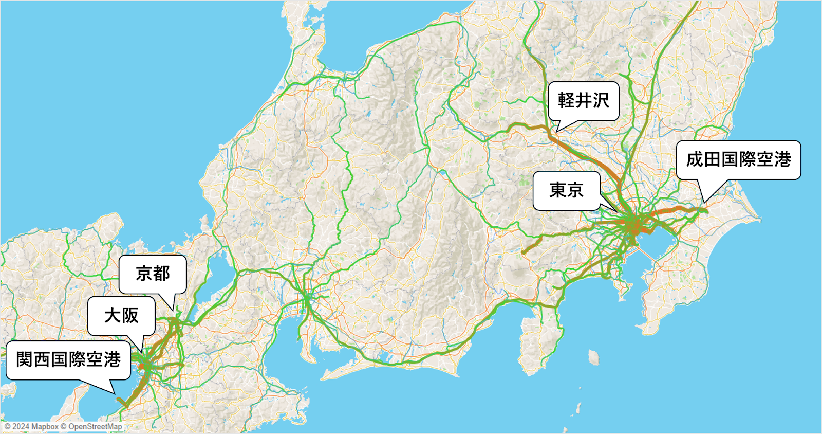 ナビタイムジャパンの移動データ事業では、道路交通や公共交通、国内観光や訪日外国人について、移動に関する各種ビッグデータを活用した分析を行っています。