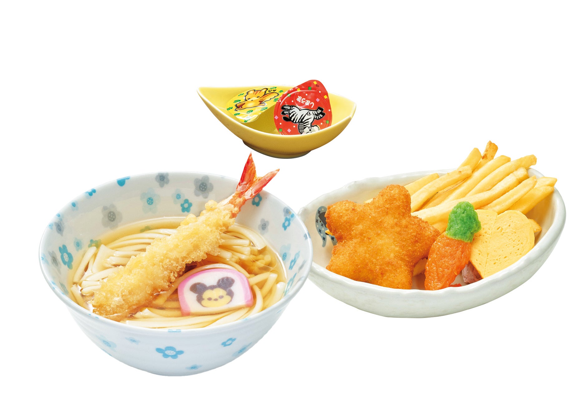 えび天がのった、ちゅるちゅるうどんと、お子様が大好きなポテト・コロッケなどのおかず、一口ゼリーのセットです。
