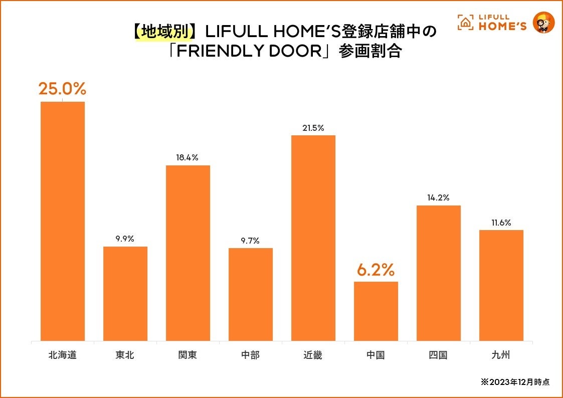 LIFULL HOME'Sに登録している不動産店舗のうち、「FRIENDLY DOOR」に参画している割合を地域別にみたところ、「北海道」(25.0%)、「近畿」(21.5%)、「関東」(18.4%)と大都市圏を中心に割合が高くなりました。一方で、「中国」(6.2%)、「中部」(9.7%)、「東北」(9.9%)など1割に満たない地域もあり、「住宅弱者」の受け入れについてはいまだ地域差が大きい状況です。