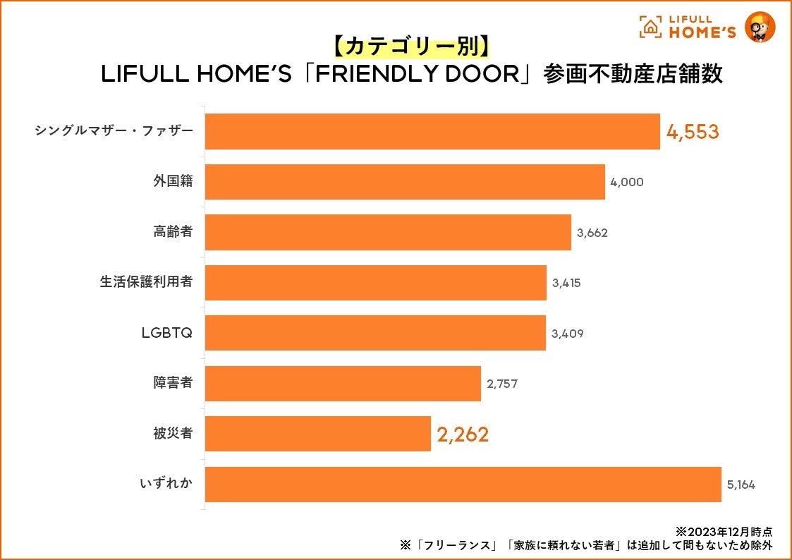 「FRIENDLY DOOR」で設定しているカテゴリーごとの(※3)参画不動産店舗数を出したところ、最も多かったのは「シングルマザー・ファザー」(4,553件、全体の88.2%)、最も少なかったのは「被災者」(2,262件、全体の43.8%)となり、その差は倍以上となりました。同じ「住宅弱者」でも、そのバックグラウンドによって受け入れられやすさには大きな差があることがうかがえます。